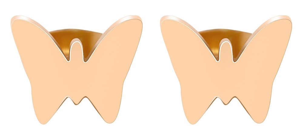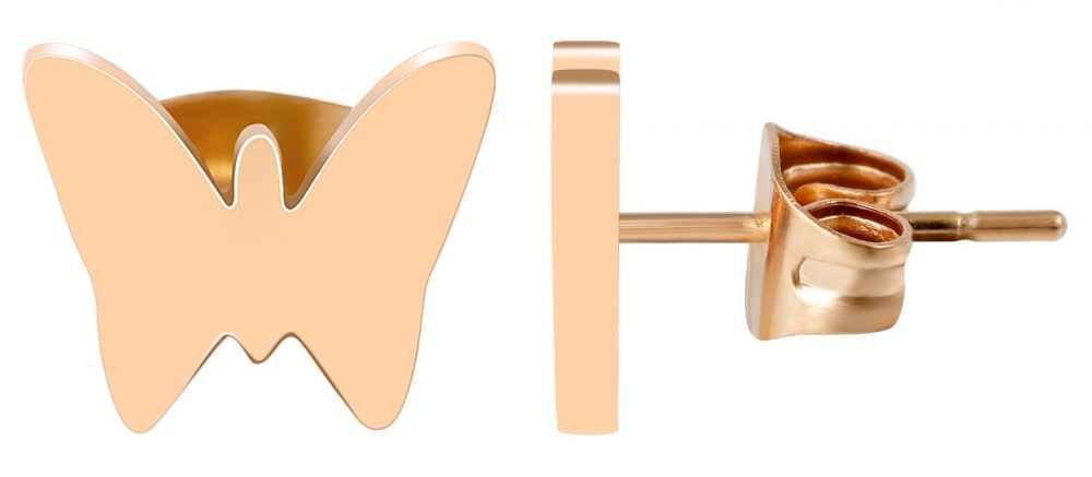 Brincos com detalhes em aço inoxidável. O fecho é um fechamento plug-in. A textura é mostrada em aço inoxidável brilhante. O item tem as seguintes dimensões: largura 10 mm, altura 8 mm, peso 1,25. Os brincos são realçados com um motivo de borboleta.