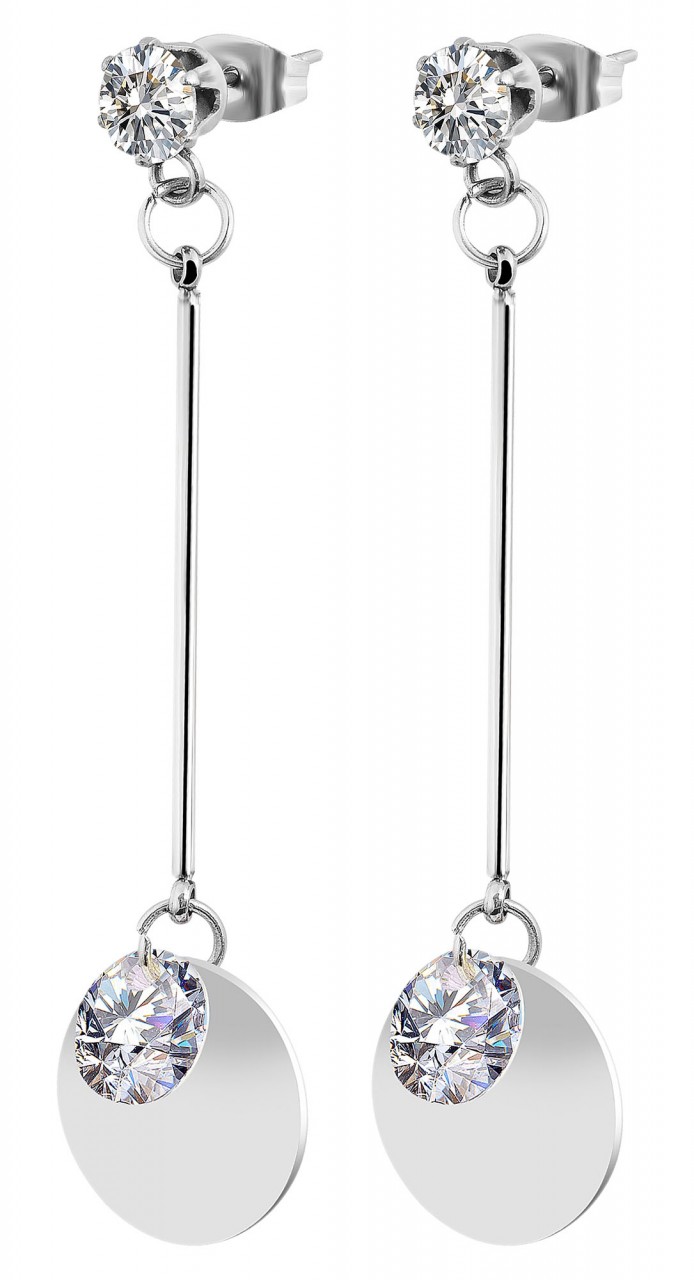 Pingente de orelha de destaque em aço inoxidável. O fecho é de pressão. A cor é prateada. O acabamento é em aço inoxidável brilhante. O artigo tem as seguintes dimensões: Comprimento: 6 cm, largura: 1,5 cm e espessura: 0,5 cm. As jóias para as orelhas são realçadas com uma pedra Swarovski.