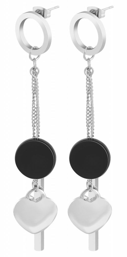 Brinco de destaque feito de aço inoxidável com pingente de coração, barra e moeda. O fechamento é um fechamento plug-in. A textura é mostrada em aço inoxidável brilhante. O item tem as seguintes dimensões: comprimento: 8 cm, largura: 1,5 cm e espessura: 0,2 cm