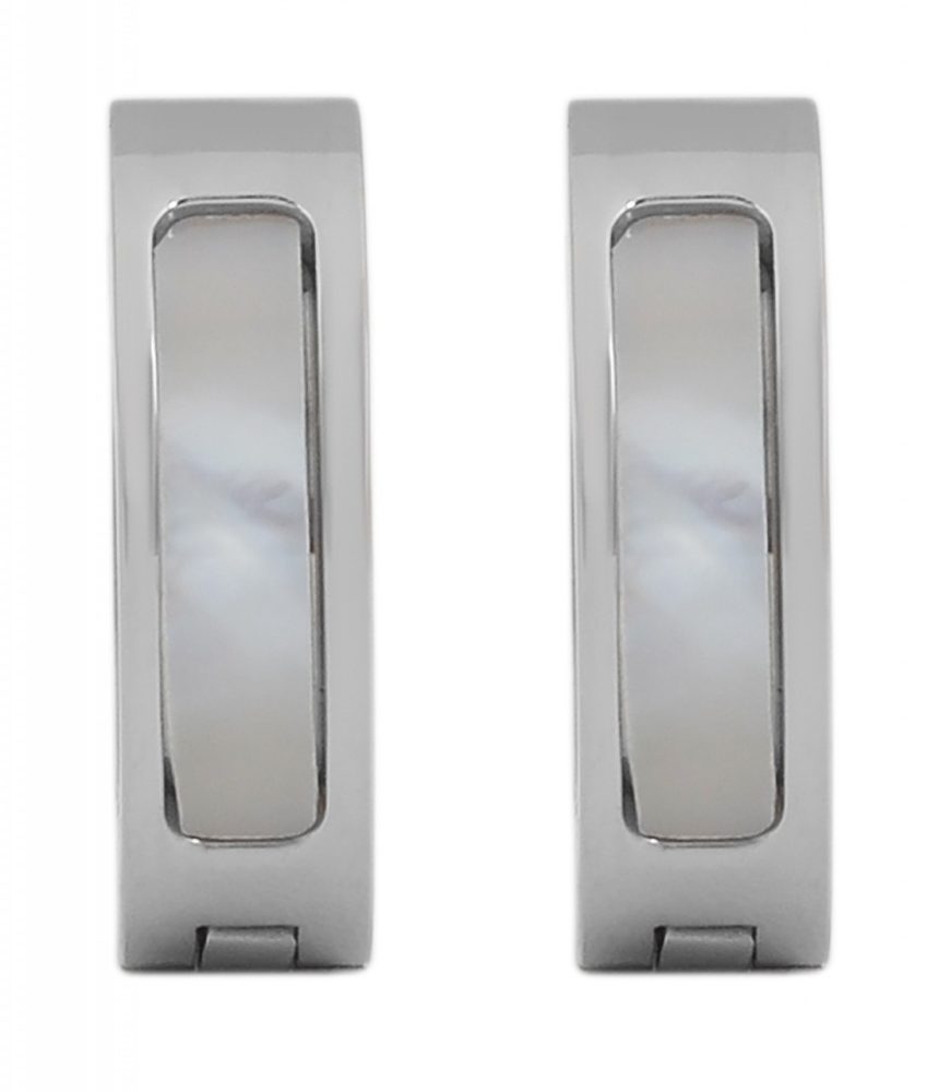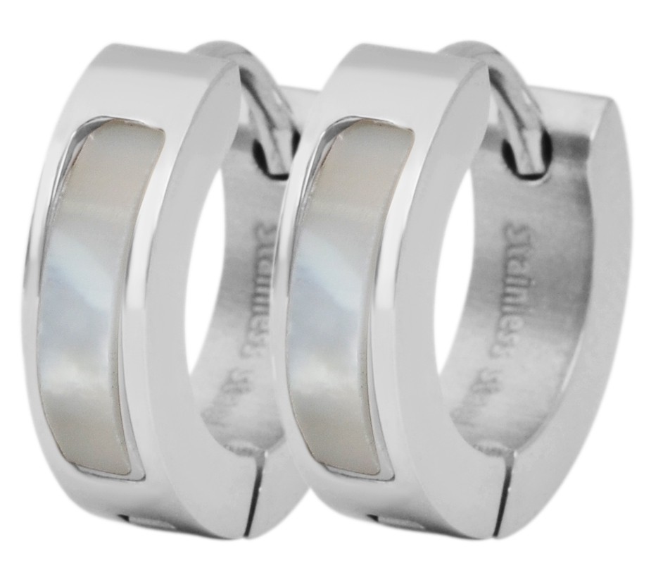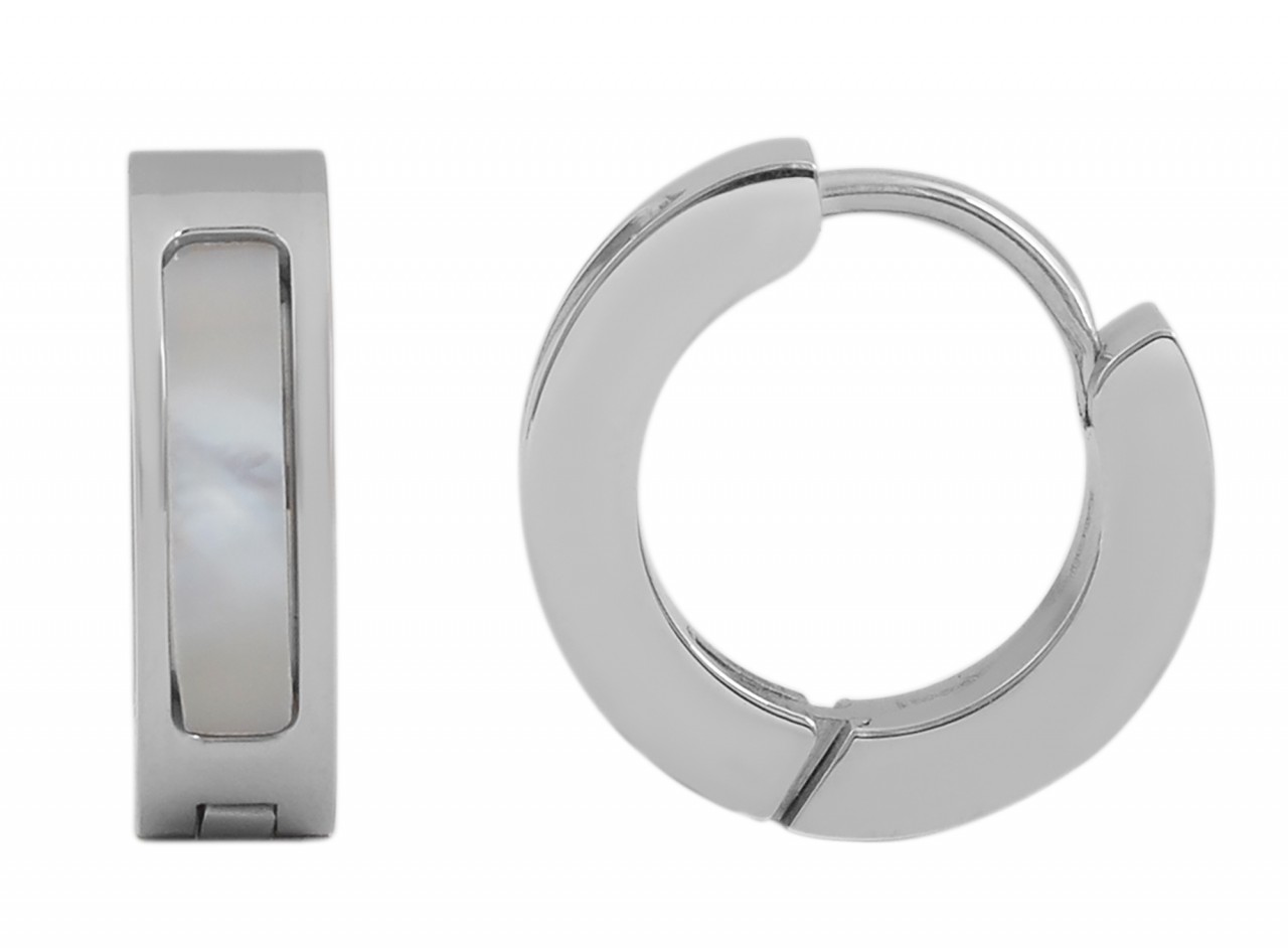 Os brincos de argola da marca Accent são feitos de aço inoxidável e decorados com uma inserção de madrepérola no meio. Os brincos redondos são abertos e fechados com fecho articulado de aço inoxidável. As dimensões são: diâmetro 13 mm, largura 4 mm e espessura 2 mm.