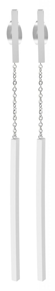 Brincos com detalhes em aço inoxidável. O fechamento é um fechamento plug-in. A textura é mostrada em aço inoxidável brilhante. O item tem as seguintes dimensões: comprimento: 8,2 cm, largura: 1,4 cm, espessura: 0,2 cm.