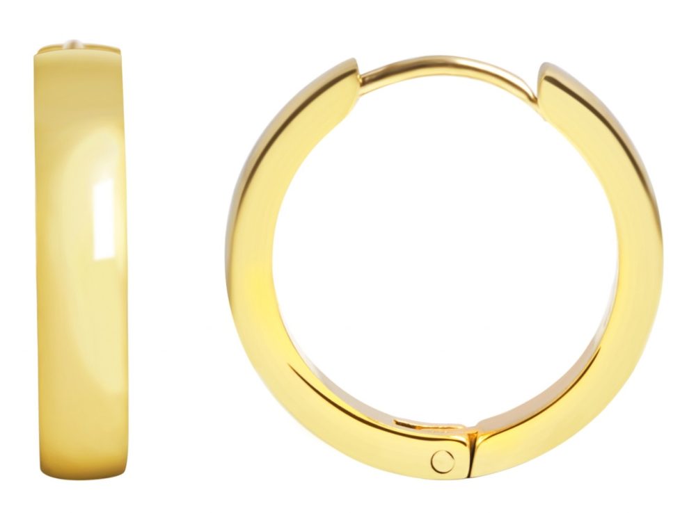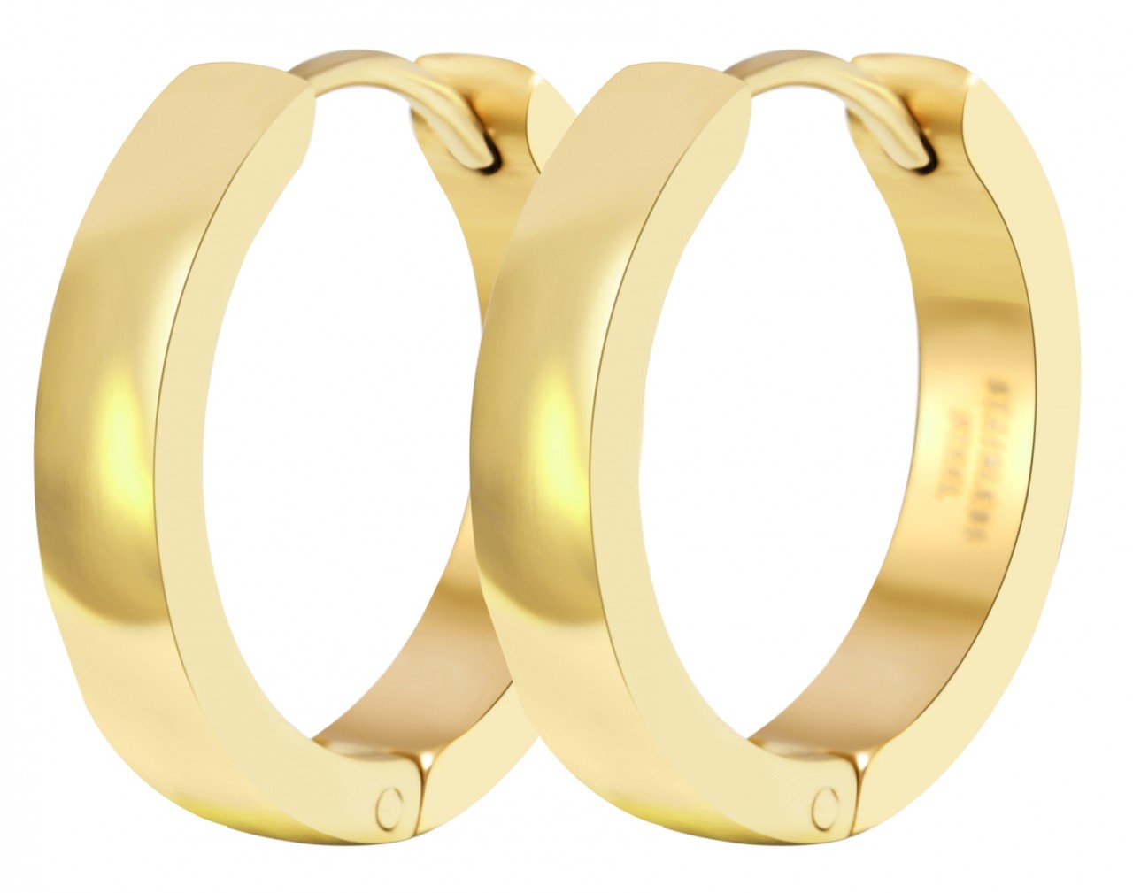 Os brincos de argola dobráveis simples da marca Praktik são feitos de aço inoxidável. O material é à prova de ferrugem e garante uma longa vida útil. Os brincos impressionam pelo brilho e chamam muita atenção. Eles podem ser presos ao orifício da orelha com um fecho articulado simples de aço inoxidável. As dimensões dos brincos de argola são 15 mm de diâmetro, 4 mm de largura e 2 mm de espessura.
