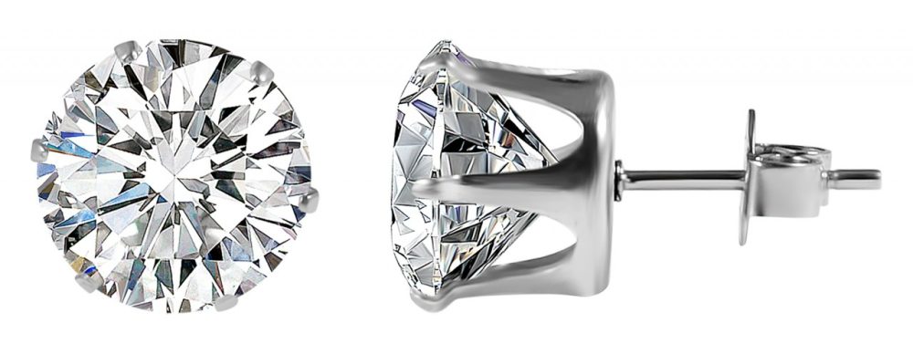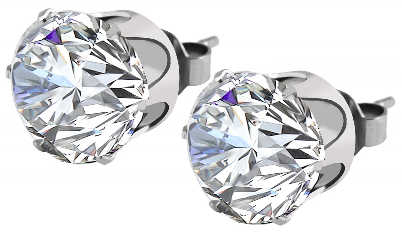 Brincos com detalhes em aço inoxidável. O fechamento é um fechamento plug-in. A cor é prata. A textura é mostrada em aço inoxidável brilhante. Diâmetro 10mm. Os brincos são realçados com pedras de zircônia prateadas.