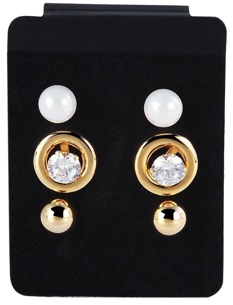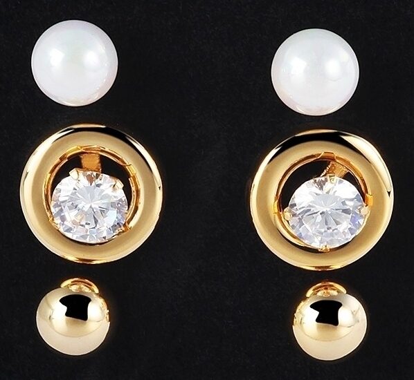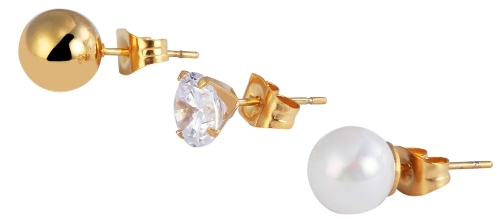 O brinco de realce é feito de aço inoxidável. O fecho é de pressão. O revestimento é feito de ouro IP. O acabamento é em aço inoxidável brilhante. O artigo tem as seguintes dimensões: Conta: diâmetro: 0,8 cm, bola: 0,8 cm e o círculo com pedra Swarovski: diâmetro; 1,3 cm e espessura: 0,7 cm. A bijuteria é realçada com 3 brincos diferentes num conjunto de cor prateada. A unidade de embalagem / PU é de 3 peças e tem um peso de 13,65 g