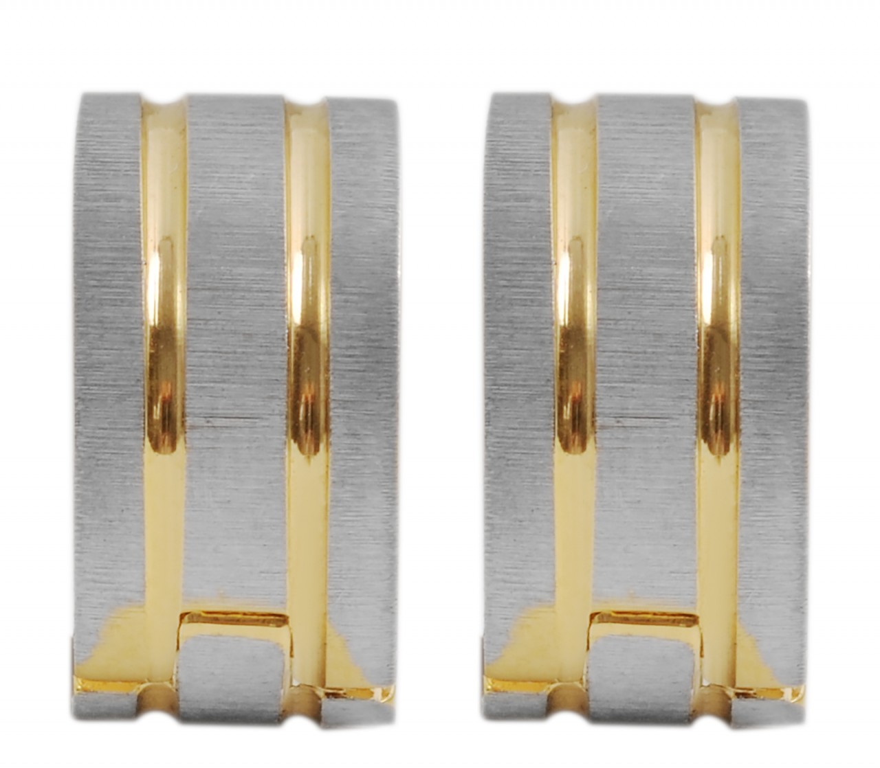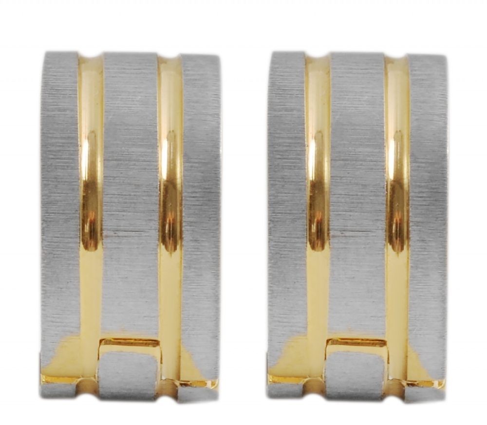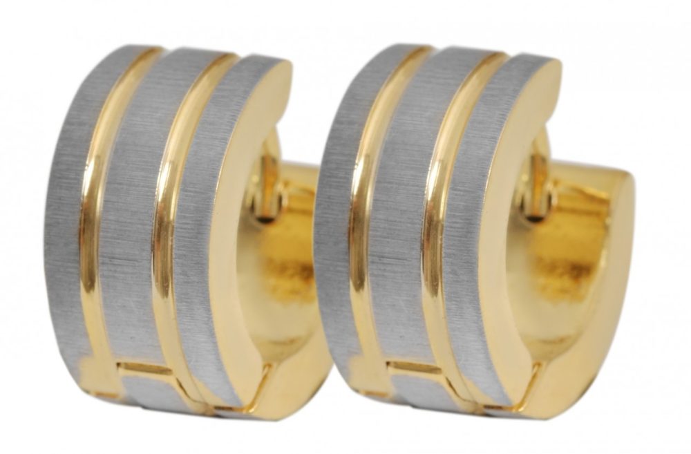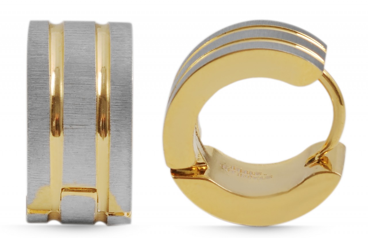 Os brincos de argola da marca Akzent são feitos de aço inoxidável. São bicolores e têm um aspeto mate e polido. A superfície prateada é fosca e as listras douradas são polidas. As bordas externas também brilham em aço inoxidável dourado. Este design confere aos brincos de argola dobráveis um visual especial e os torna um grande destaque. As dimensões resultam de um diâmetro de 9,5 mm, largura de 6 mm e espessura do material de 2 mm.