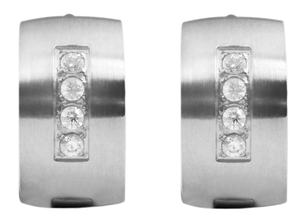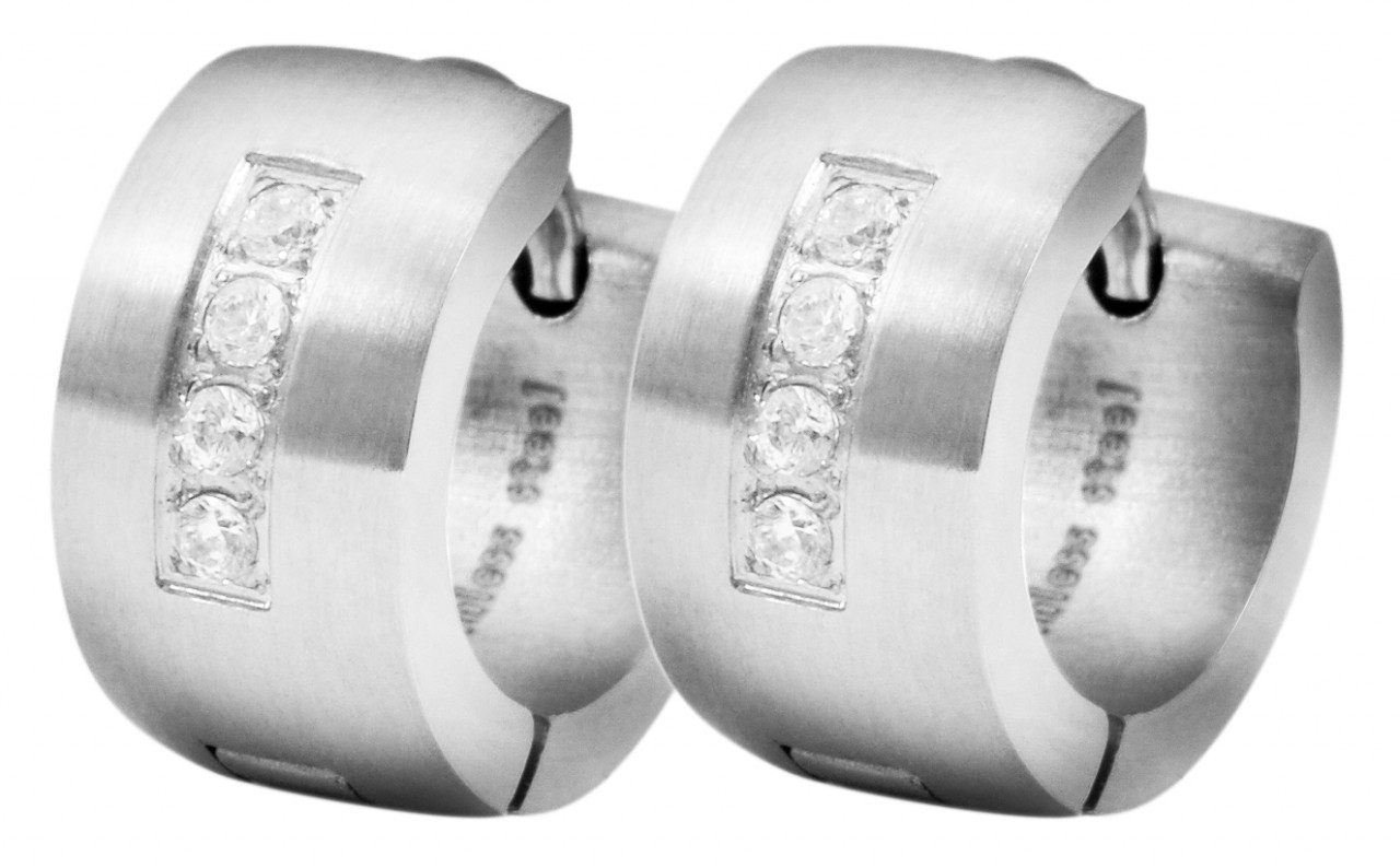 Os brincos de argola dobráveis são feitos de aço inoxidável e também possuem 4 pedras simili brilhantes por argola. Os brincos são prateados. A textura do material é fosca. O fecho articulado permite que os brincos sejam abertos e fechados com facilidade. O artigo tem as seguintes dimensões: diâmetro: 9 mm, largura 7 mm e espessura 2 mm.