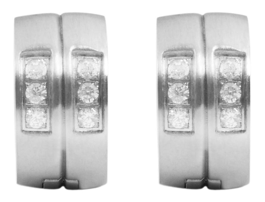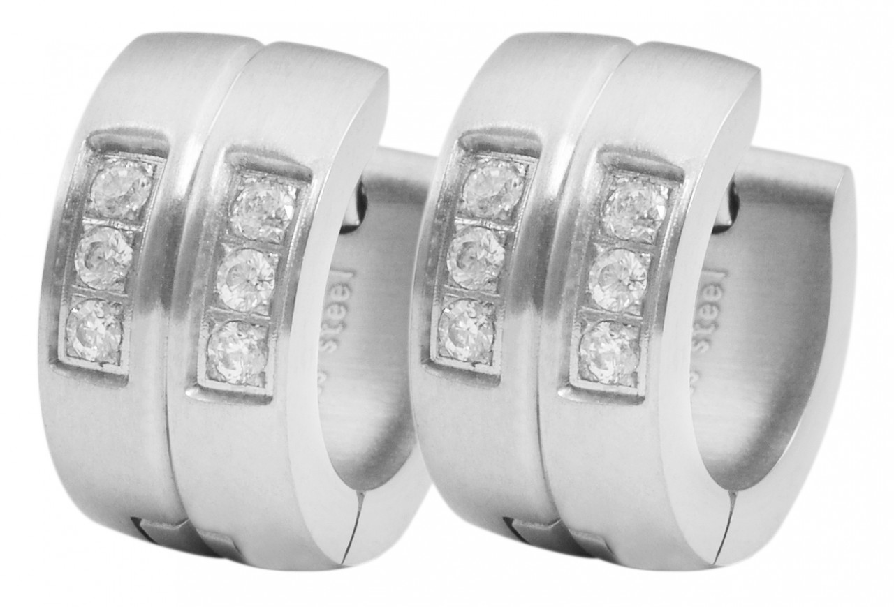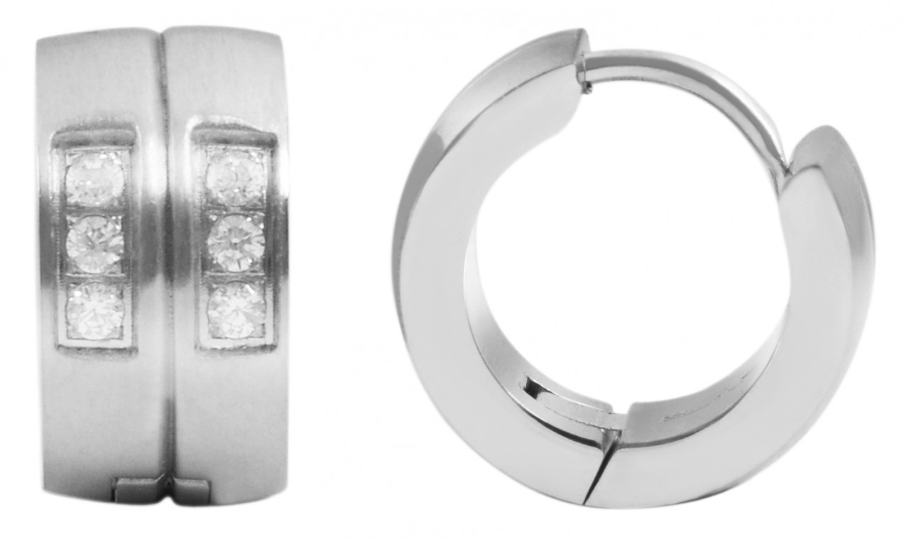 Os brincos de argola dobráveis são feitos de aço inoxidável e possuem adicionalmente 6 pedras simili brilhantes por argola. Os brincos são prateados. A textura do material é fosca. O fecho articulado permite que os brincos sejam abertos e fechados com facilidade. O artigo tem as seguintes dimensões: diâmetro: 9 mm, largura 7 mm e espessura 3 mm.