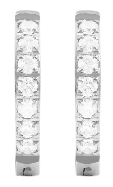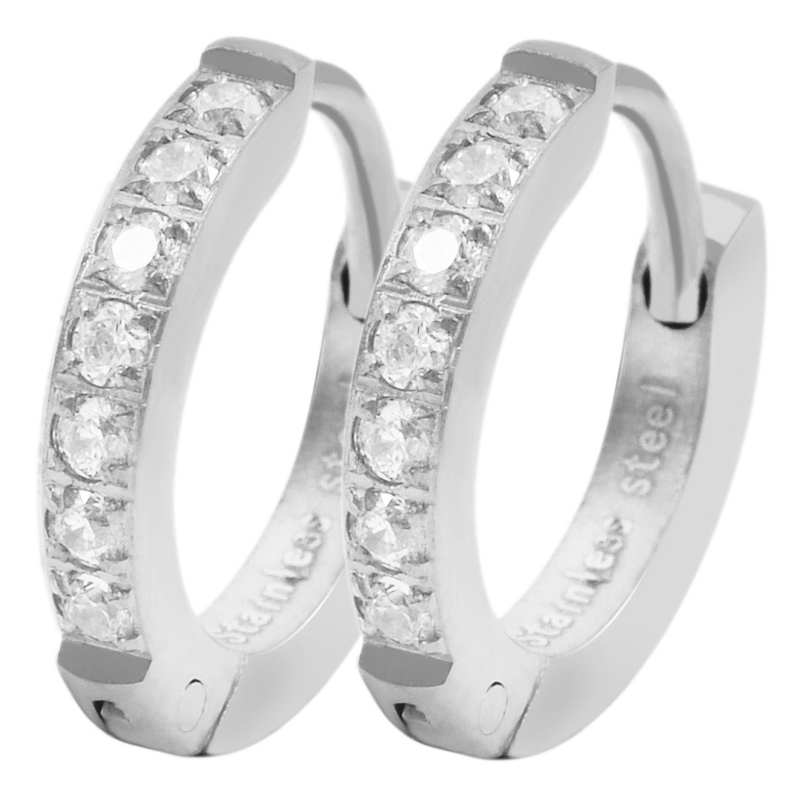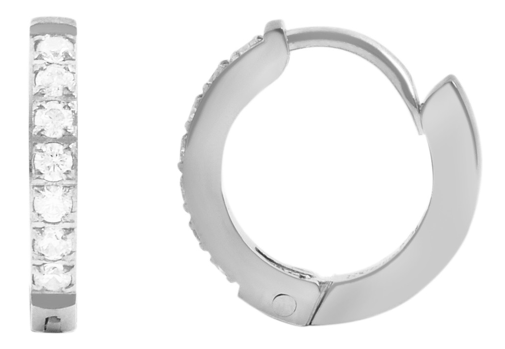 Os brincos de argola dobráveis são feitos de aço inoxidável e também possuem 7 pedras simili brilhantes por argola. A textura do material é fosca. O fecho articulado permite que os brincos sejam abertos e fechados com facilidade. O artigo tem as seguintes dimensões: diâmetro: 9 mm, largura 2 mm e espessura 2 mm.