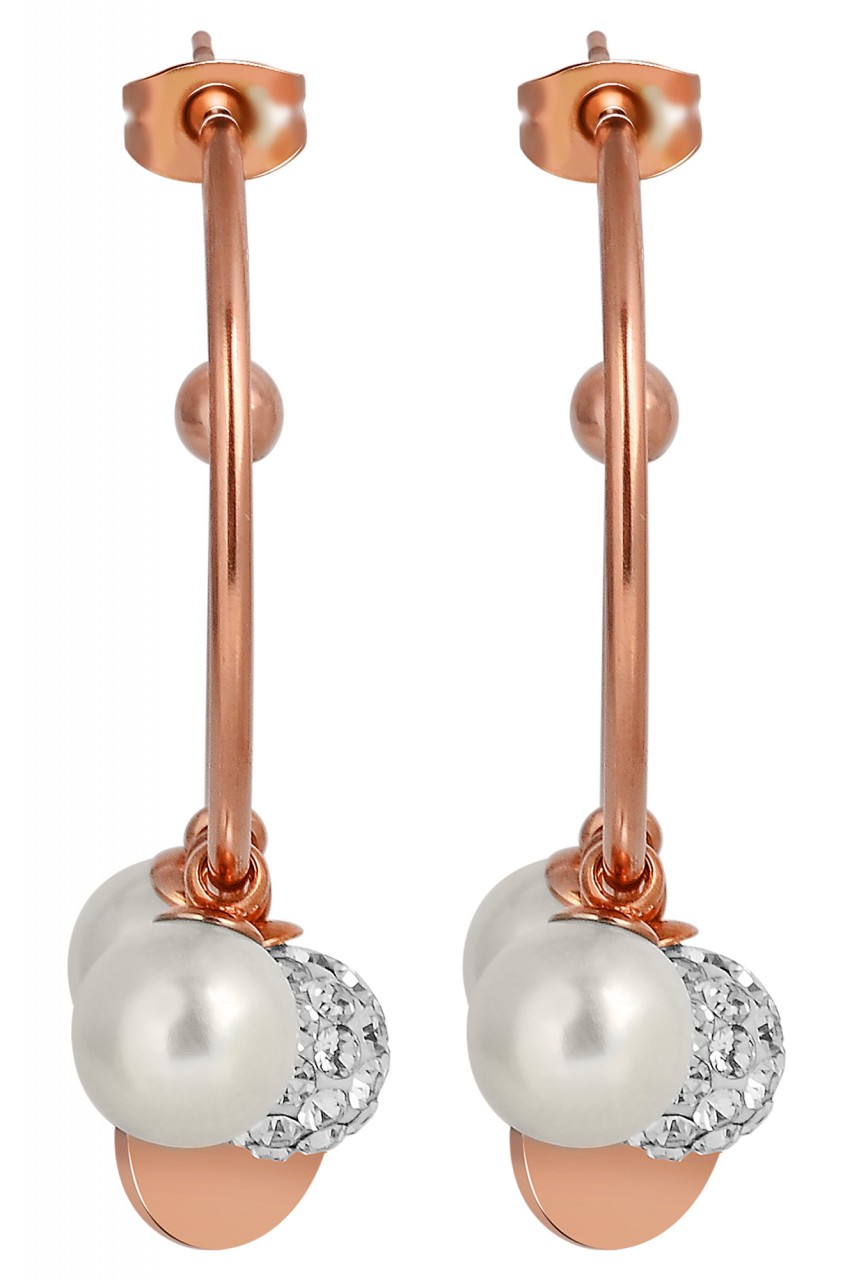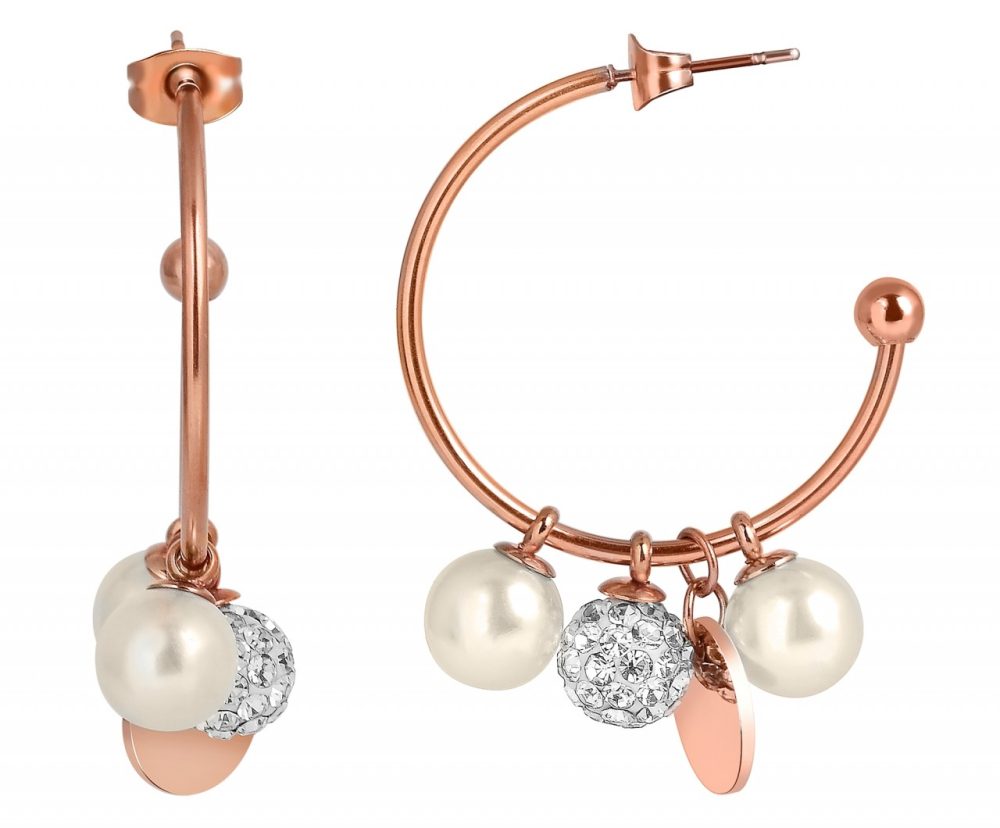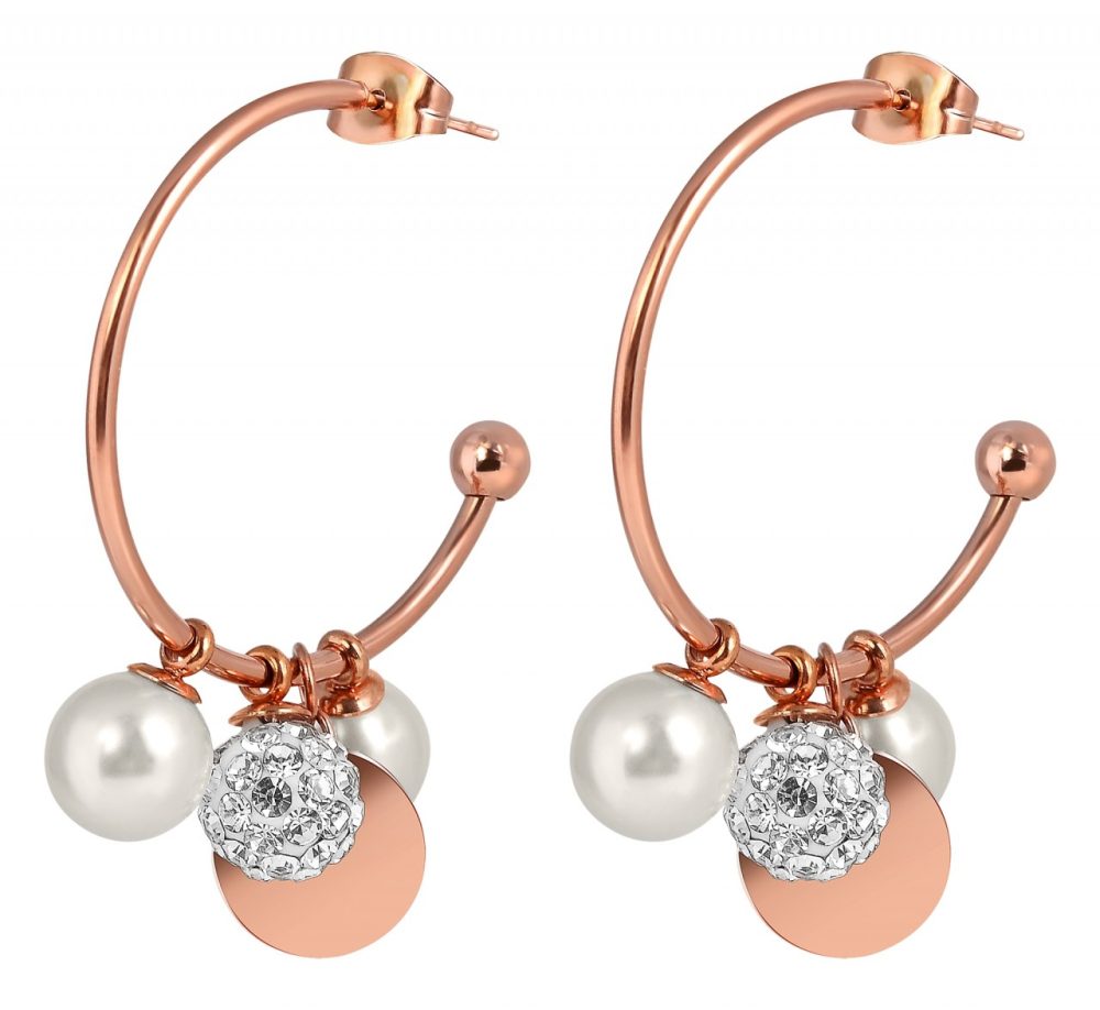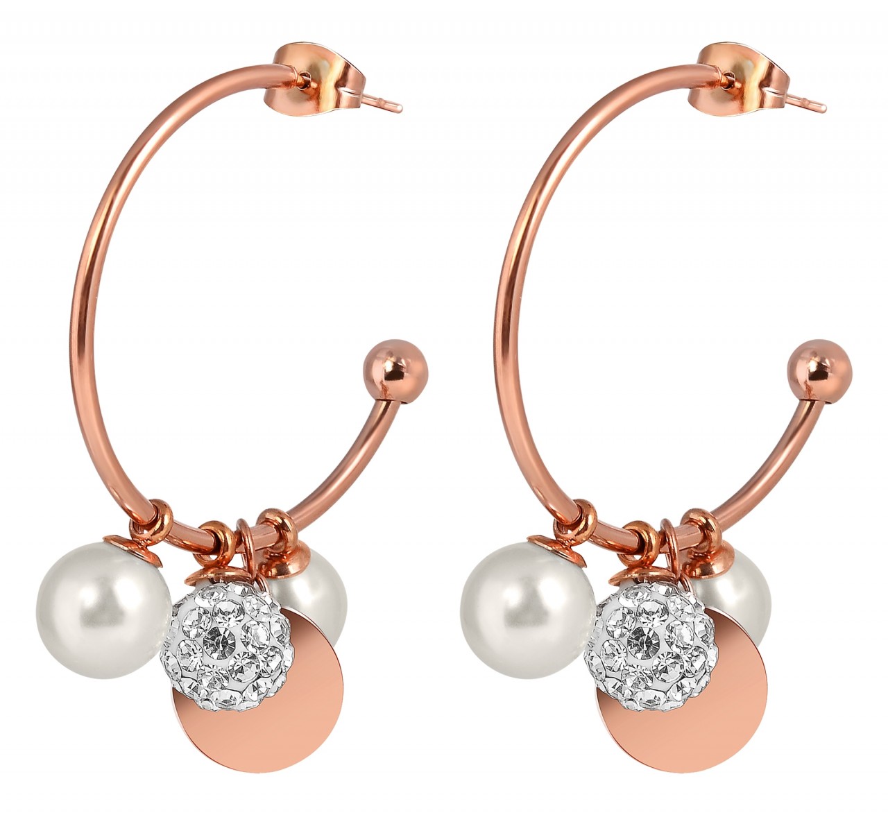 Os brincos de argola semicirculares da marca Akzent são feitos de aço inoxidável e estão disponíveis em diversas cores. Têm um diâmetro de 25 mm e uma espessura de material de 1,5 mm. Duas pérolas artificiais, uma placa de aço inoxidável e um conjunto de bolas com pedras simil estão presas aos brincos de argola. Eles podem ser removidos conforme desejado, removendo o parafuso borboleta, o que garante uma fixação segura no orifício da orelha. Além disso, a pequena placa - com diâmetro de 10 mm - pode ser fornecida com delicadas gravuras. Resumindo, estes brincos são uma joia muito especial que pode ser desenhada individualmente e, portanto, se adapta a cada roupa e a cada ocasião.