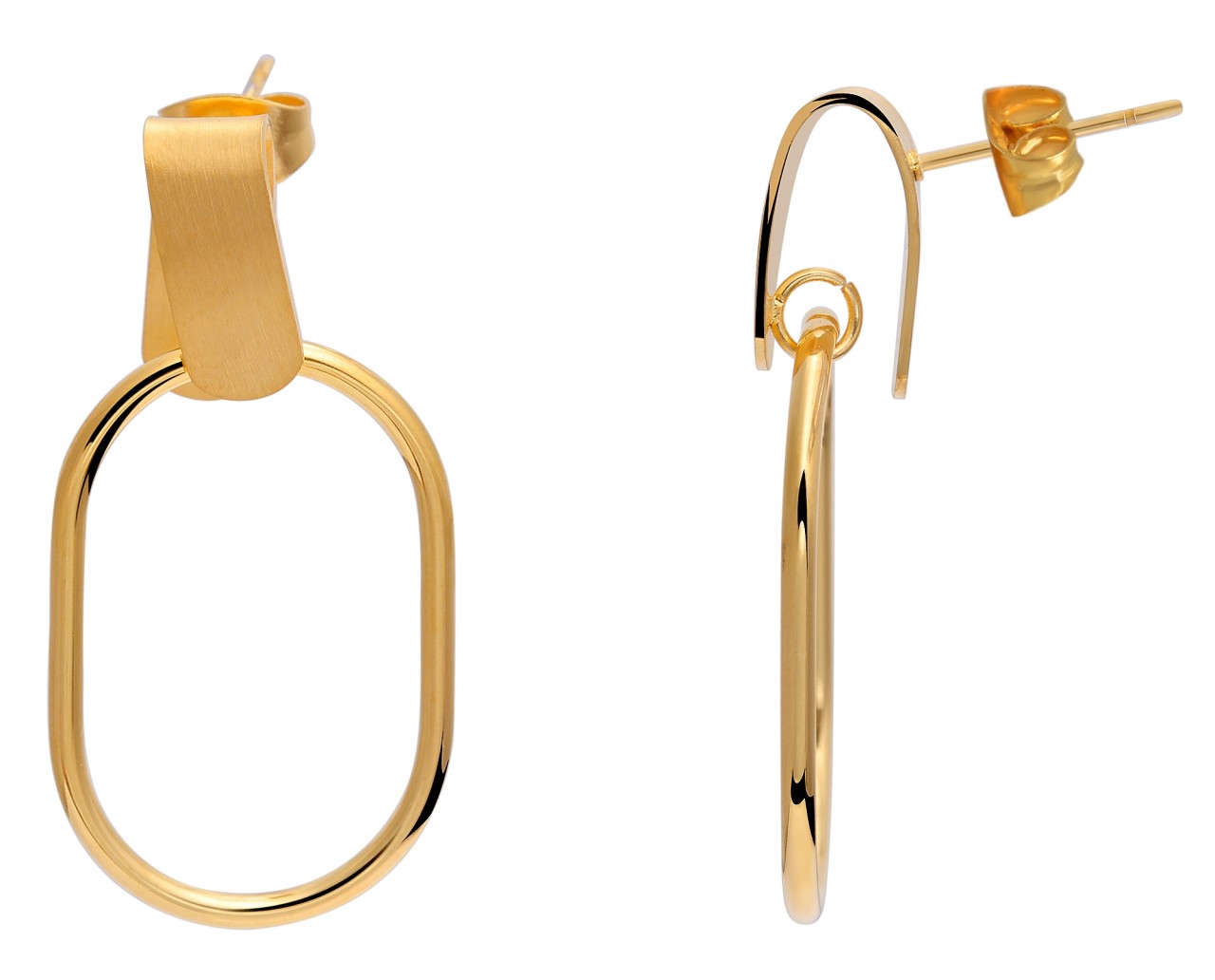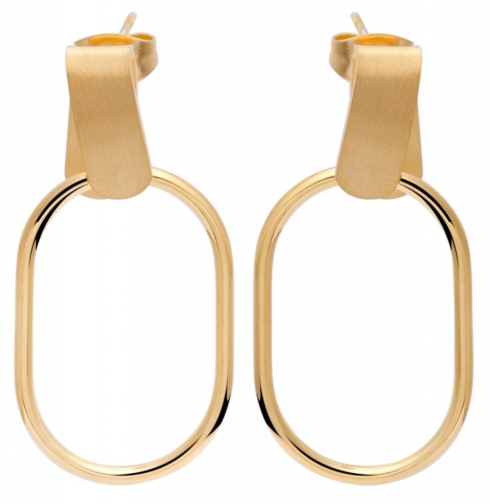 Os elegantes brincos da marca Akzent são feitos de aço inoxidável e estão disponíveis em diversas cores. A qualidade da superfície é mate e polida e o visual dos brincos impressiona pelo seu design especial. Dois anéis ovais de aço inoxidável são fixados a um ilhó em um elemento semicircular de aço inoxidável fosco, que balança elegantemente a cada movimento. Os plugues suspensos são fixados ao orifício da orelha com um prático parafuso borboleta, também feito de aço inoxidável. O conteúdo da entrega também inclui porcas de orelha confortáveis ​​com placa de silicone, que garantem maior segurança. As dimensões resultam de um comprimento de 33 mm, largura de 17 mm e espessura do material de 1 mm.