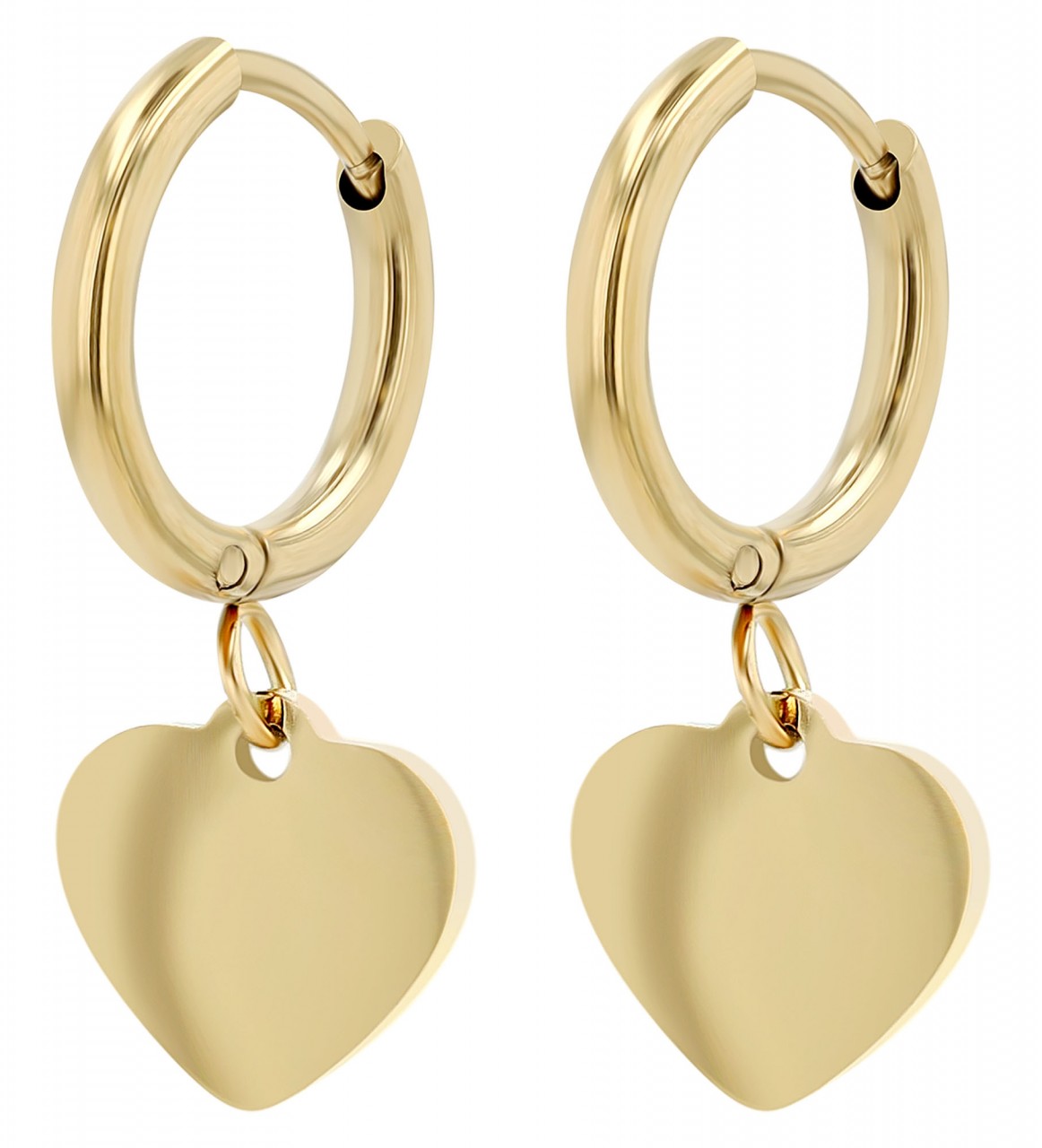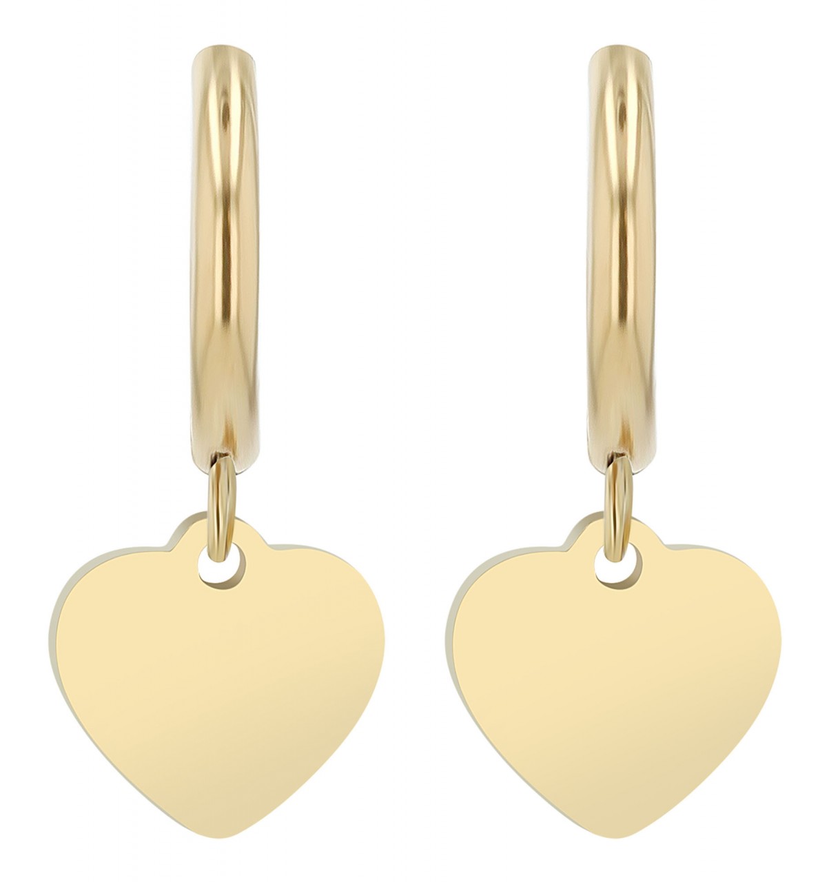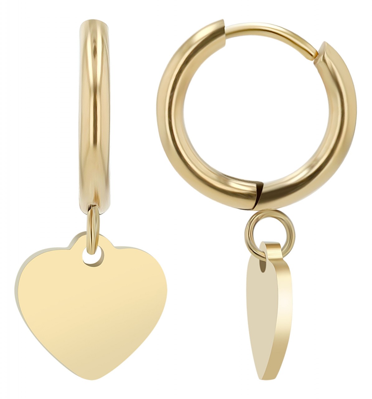 Os brincos de argola dobráveis da marca Praktik são feitos de aço inoxidável. O diâmetro dos brincos de argola é de 7 mm, a largura é de 1,5 mm e a espessura é de 1 mm. Há um ilhó preso na parte inferior dos brincos de argola com um pequeno pingente de coração preso a ele. Tem 8 mm de comprimento, 8 mm de largura e uma espessura de material de 1 mm. Os pequenos pingentes balançam suavemente a cada movimento e adicionam detalhes modernos. Os brincos estão disponíveis em prata e ouro.