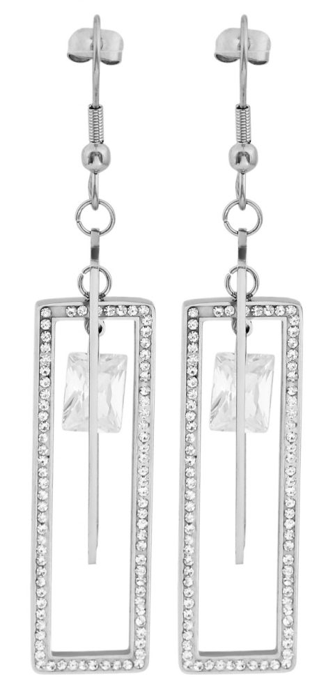 Os brincos da marca Accent são feitos de aço inoxidável e possuem um total de 84 strass. Os elegantes brincos são compostos por três elementos. Eles consistem em um retângulo cravejado de strass ao qual uma pequena pedra de cristal retangular está fixada. Além disso, um retângulo simples de aço inoxidável realça ainda mais os brincos geométricos. As dimensões são: comprimento 65 mm, largura 12 mm e espessura 2 mm.