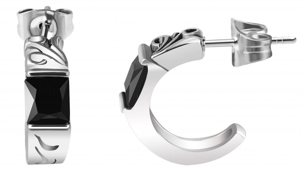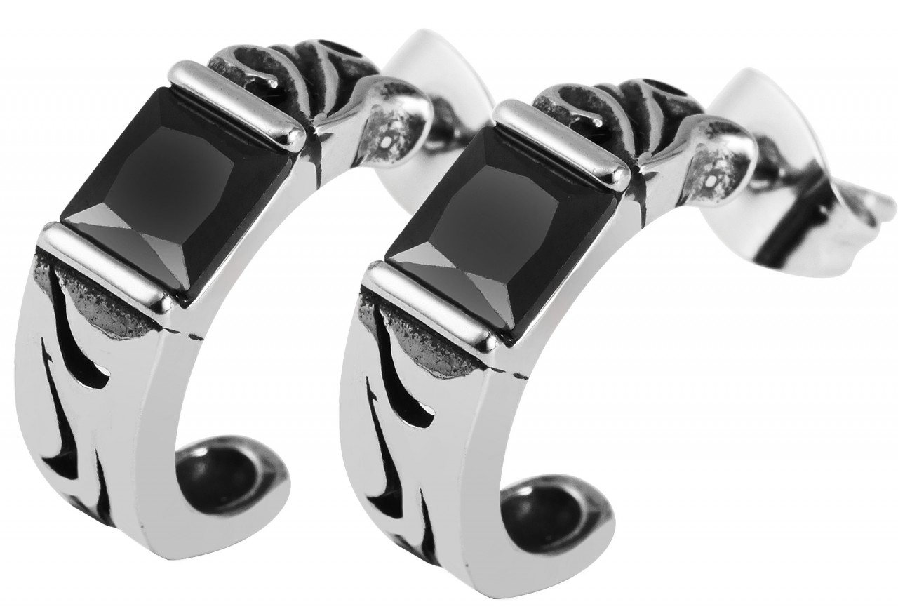 Brincos com detalhes em aço inoxidável. O fechamento é um fechamento plug-in. A textura é mostrada em aço inoxidável fosco e brilhante. O item possui as seguintes dimensões: diâmetro; 1,5 cm e espessura: 0,5 cm com pedra.