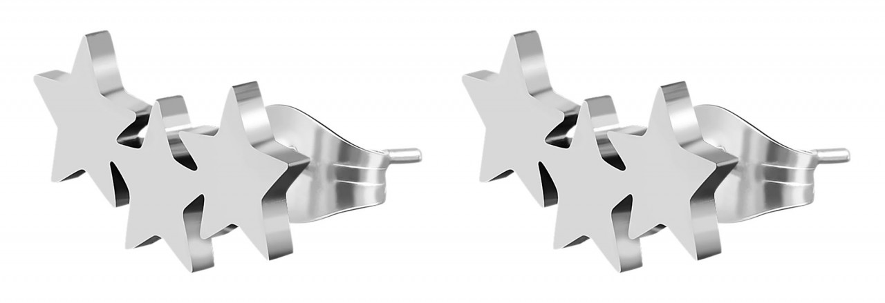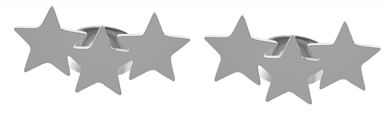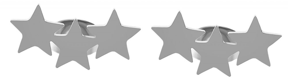 Os brincos da marca Akzent são feitos de aço inoxidável e estão disponíveis em diversas cores. O material revela-se particularmente robusto, durável e amigo da pele. O desenho dos brincos é composto por três estrelas amarradas entre si, que possuem acabamento brilhante. Têm comprimento de 19 mm, largura de 6 mm e espessura de 1 mm. Os brincos podem ser presos ao orifício da orelha com um parafuso borboleta. A porca de conforto incluída com placa de silicone fornece suporte adicional.