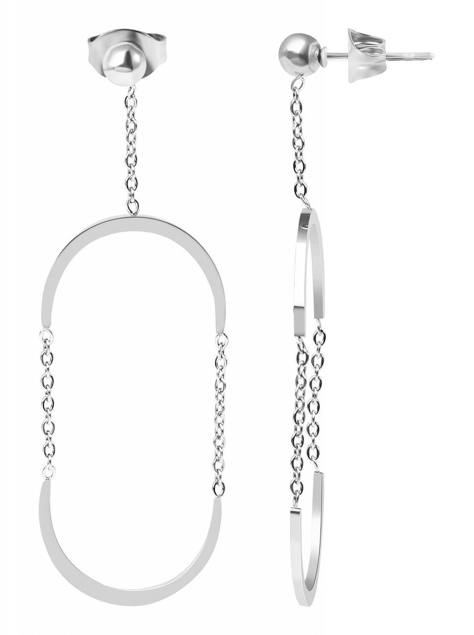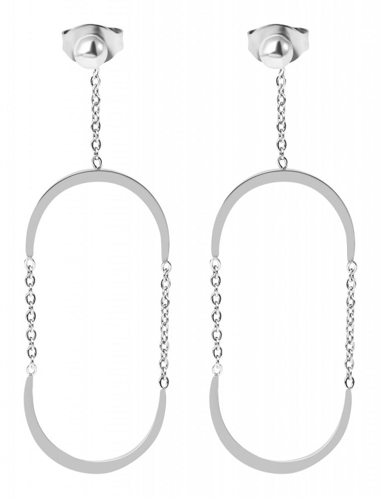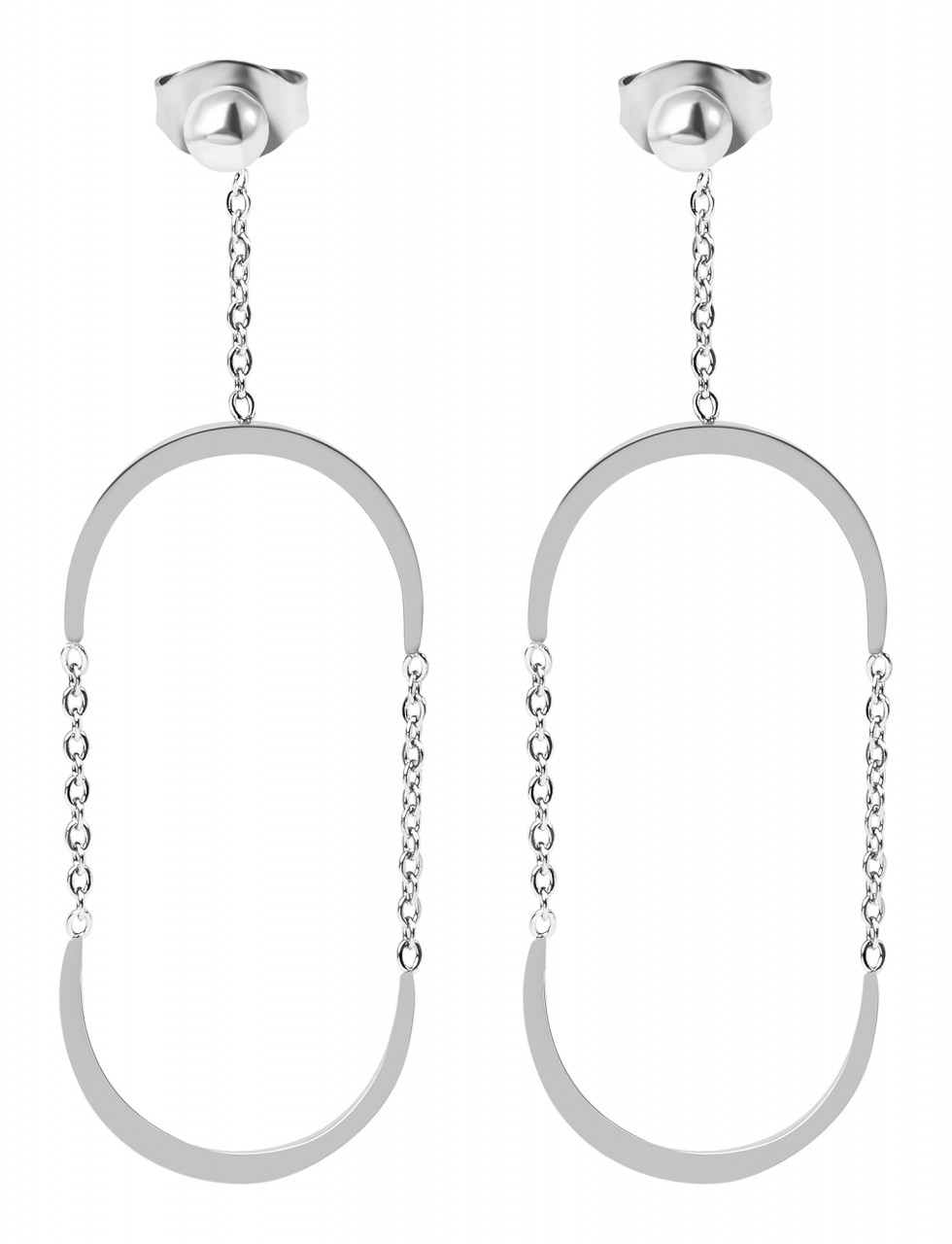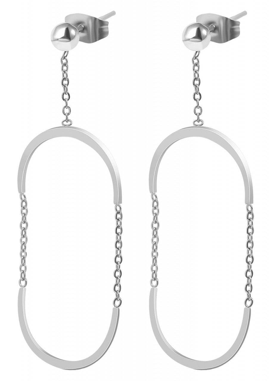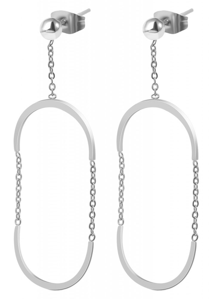 Brinco de realce em aço inoxidável. O fecho é de pressão. O acabamento é em aço inoxidável brilhante. O artigo tem as seguintes dimensões: Comprimento: 5,8 cm, largura: 1,7 cm e espessura: 0,1 cm