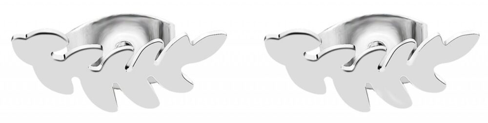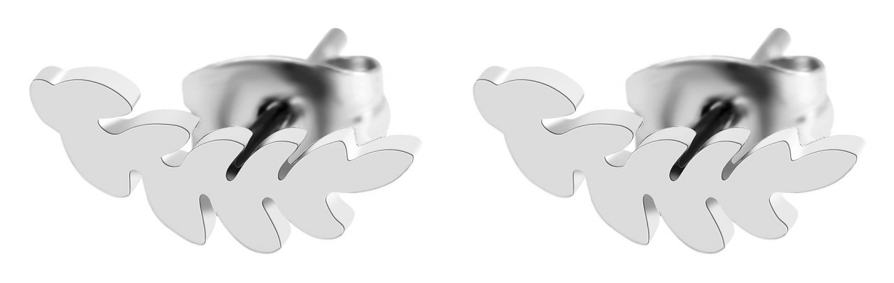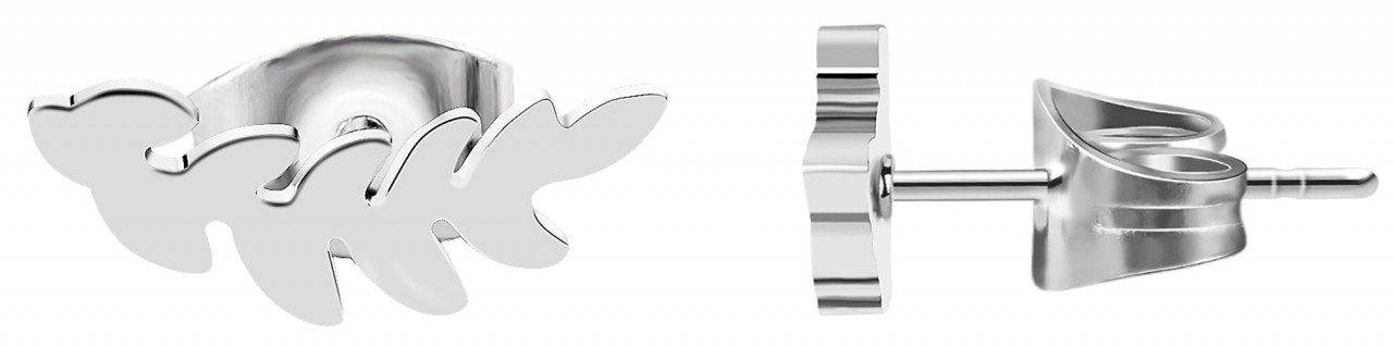 O brinco de realce com a forma de uma pena é feito de aço inoxidável. O fecho é de pressão. O acabamento é em aço inoxidável brilhante. O artigo tem as seguintes dimensões: comprimento: 1,2 cm, largura: 0,4 cm e espessura: 0,1 cm