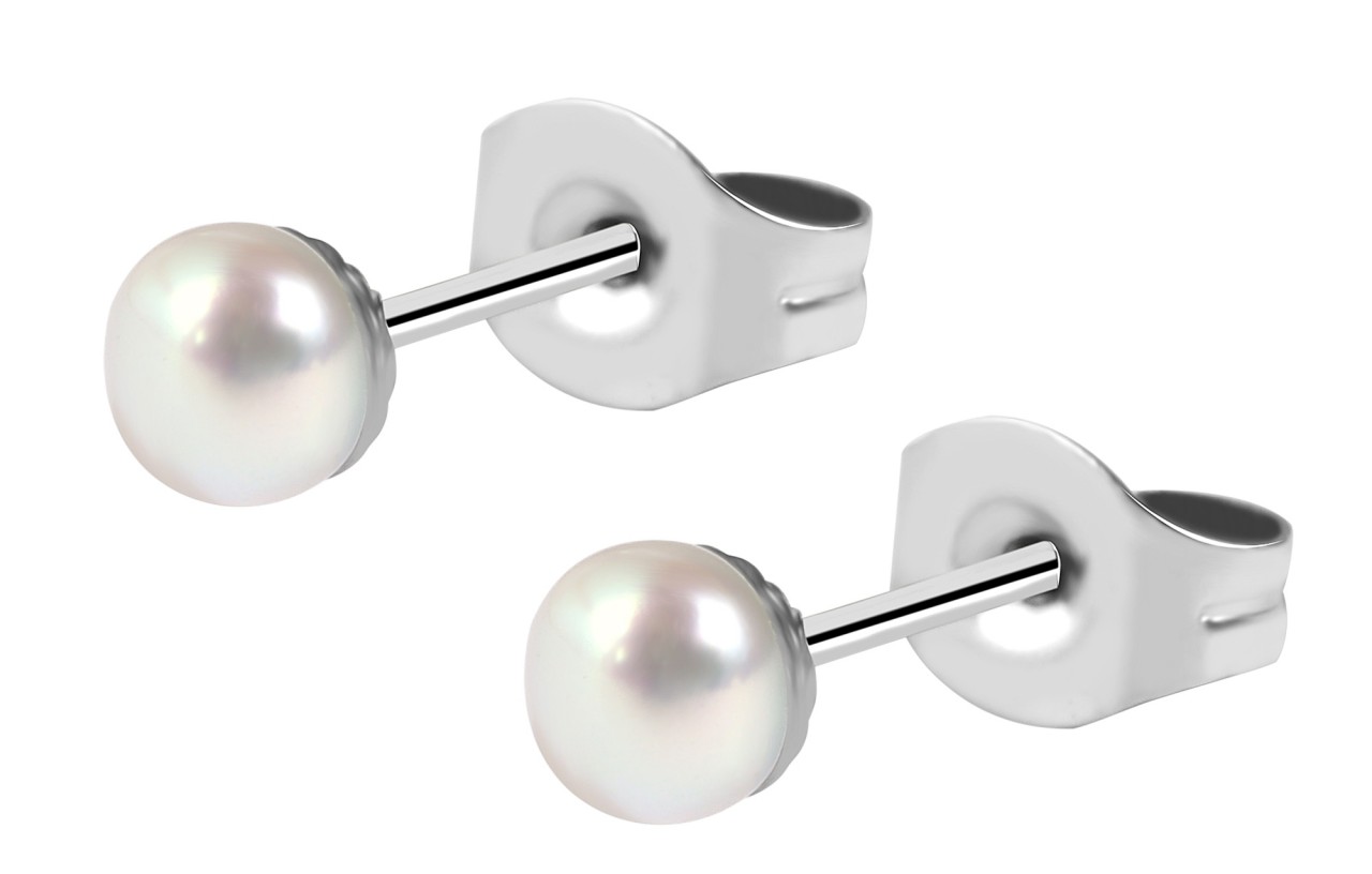 Os brincos prateados da marca Praktik são feitos de aço inoxidável. A cabeça do plug é decorada com uma pérola de água doce e torna a delicada joia particularmente elegante. A pérola cultivada tem diâmetro de 4 mm. Os brincos podem ser presos com segurança à orelha com um parafuso borboleta. Também é possível usar a porca de conforto incluída com uma placa de silicone.