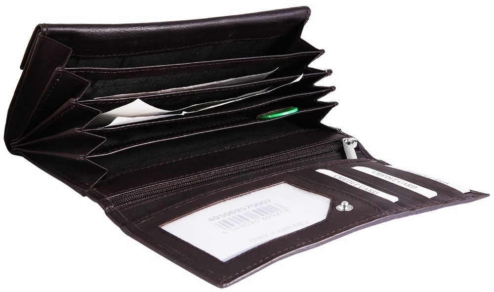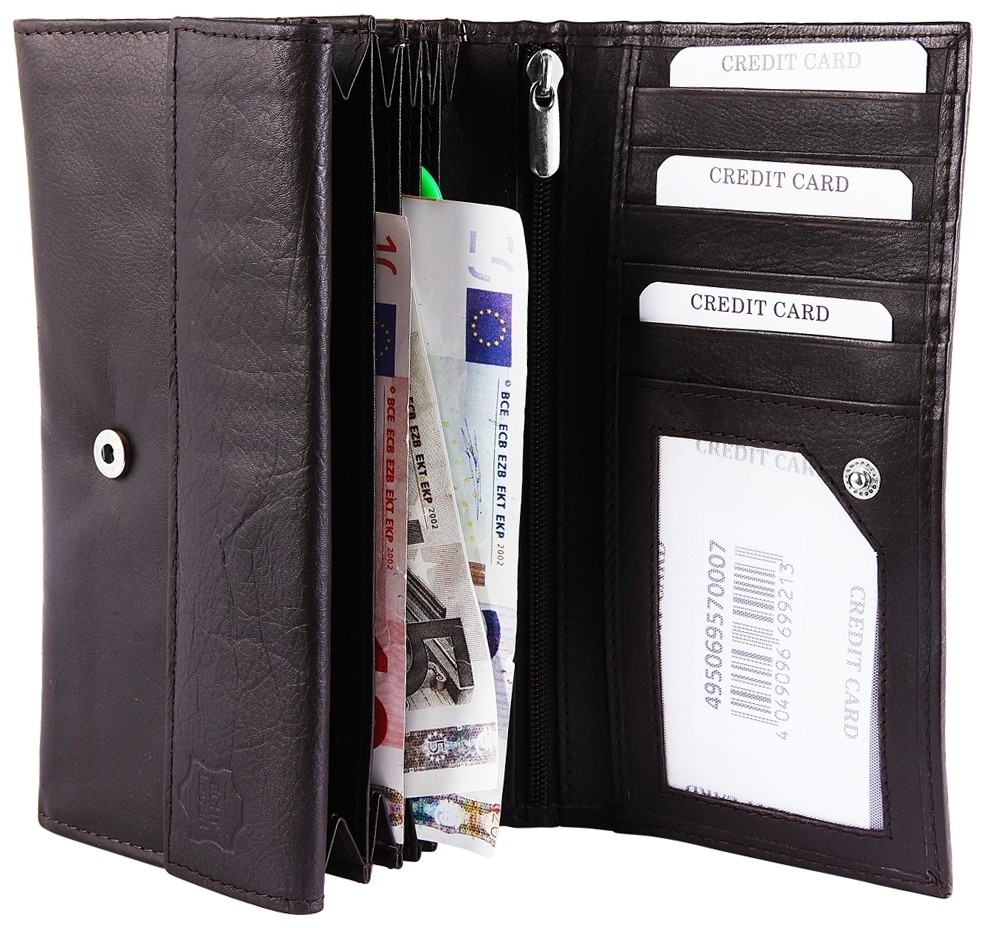 Carteira feminina em couro legítimo. A carteira paisagem tem 17 cm de largura e 9 cm de altura. A cor é marrom escuro. A carteira de couro genuíno é fechada com fecho de pressão. Possui 6 compartimentos para notas, um compartimento para troco, 5 compartimentos para cartões de crédito e um compartimento transparente para cartões de crédito.