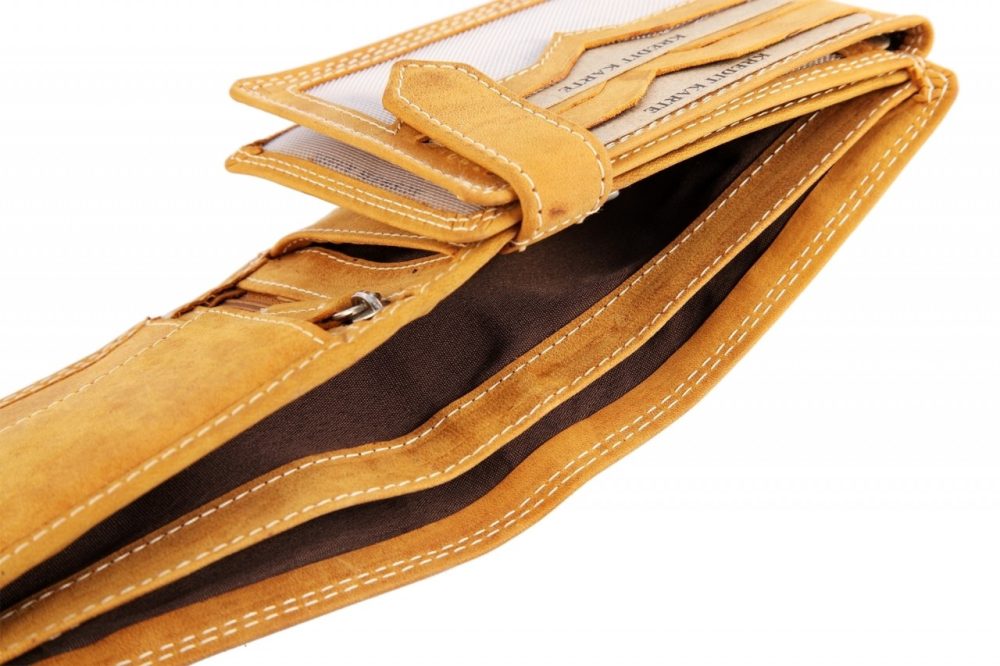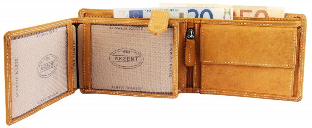 A carteira da marca Accent é feita de couro genuíno em formato paisagem. É composto por dois compartimentos para notas, um compartimento para moedas e um compartimento expansível para cartões. Os compartimentos para notas estão localizados na parte traseira e o compartimento para moedas no lado direito. No lado esquerdo da carteira existem três slots para cartões que podem ser operados por cima. Existem dois compartimentos práticos para identificação atrás dos compartimentos para cartões. O estojo de couro com compartimentos para cartões e cartões de identificação pode ser aberto duas vezes para a esquerda e também é fechado com um botão de pressão. Existem slots de cartão adicionais sob o segundo compartimento de identificação e na parte traseira. Existem dois bolsos grandes por baixo destes e por baixo do compartimento para moedas. As dimensões são comprimento de 10,2 cm, largura de 12,5 cm e altura de 2,5 cm.
