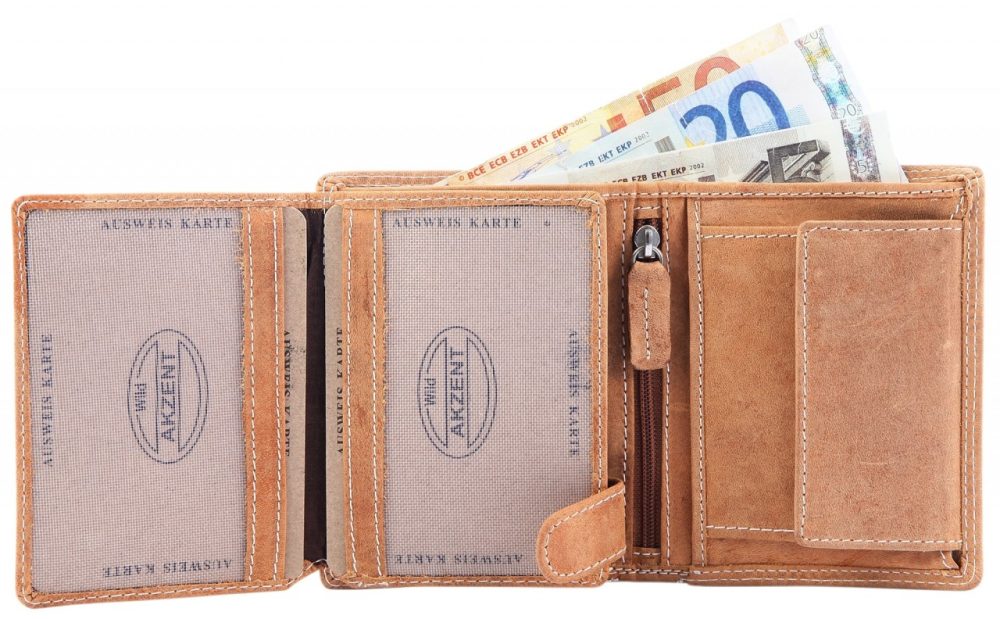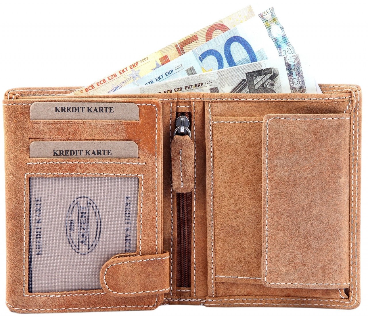 Carteira masculina de destaque feita de couro genuíno. A carteira retrato tem 9 cm de largura e 12 cm de altura. A cor é. A carteira de couro genuíno é fechada com fecho de pressão. Possui 2 compartimentos para notas, um compartimento para trocos, 10 compartimentos para cartões de crédito, um compartimento transparente para cartões de crédito e 2 compartimentos transparentes para identificação.