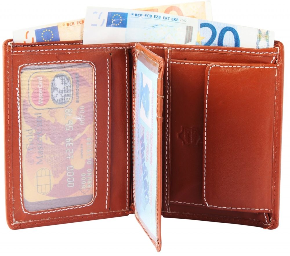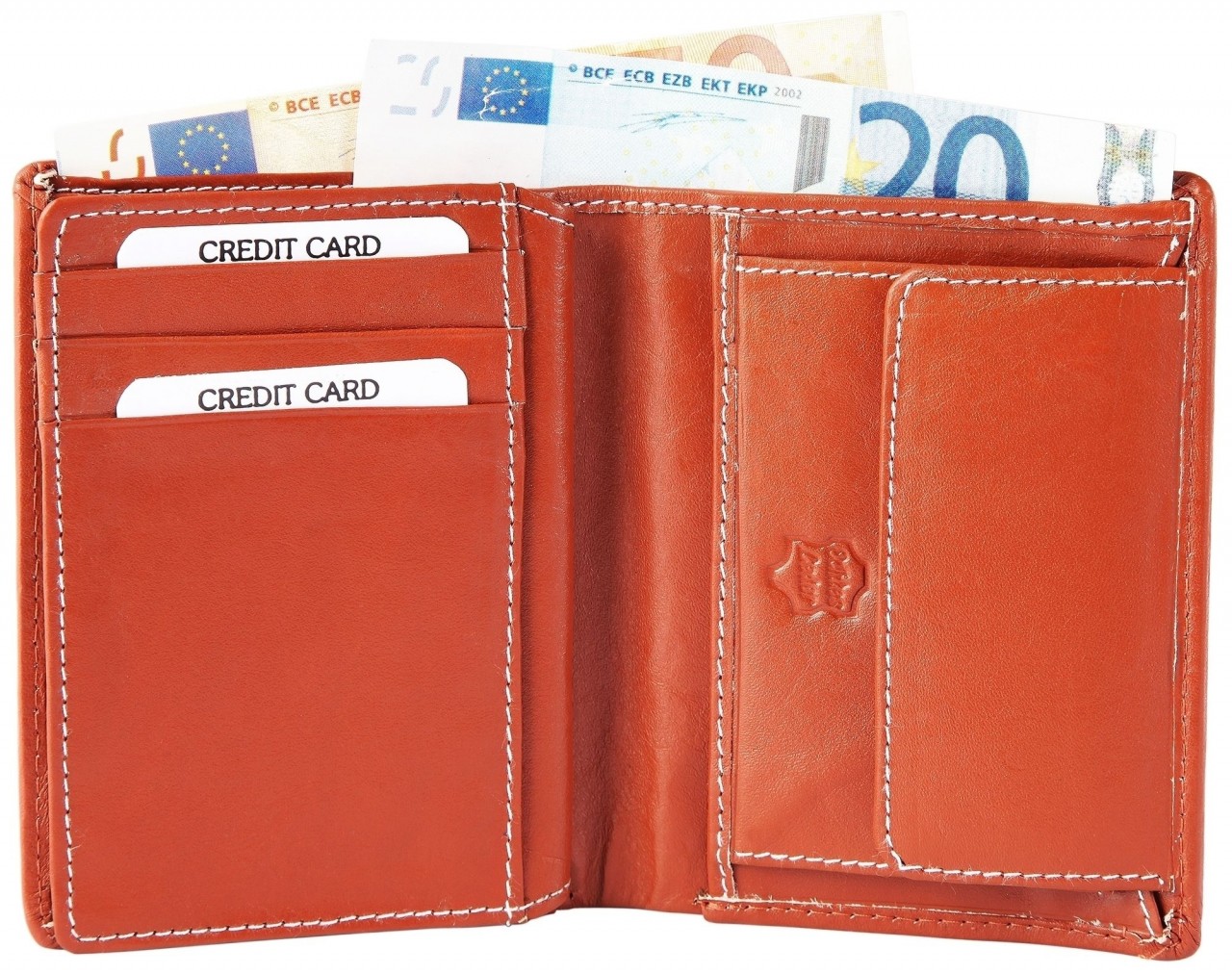 Carteira masculina de destaque feita de couro genuíno. A carteira retrato tem 10 cm de largura e 12 cm de altura. A cor é. Possui 2 compartimentos para notas, um compartimento para trocos, 6 compartimentos para cartões de crédito, um compartimento transparente para cartões de crédito e um compartimento transparente para identificação.