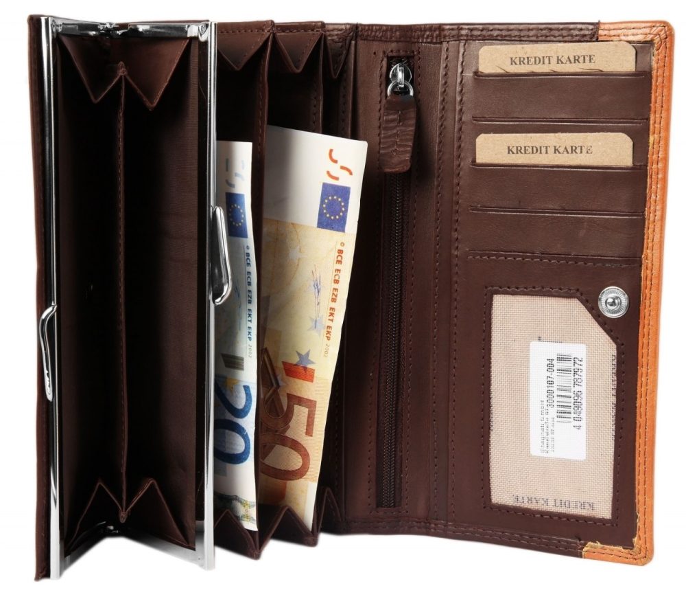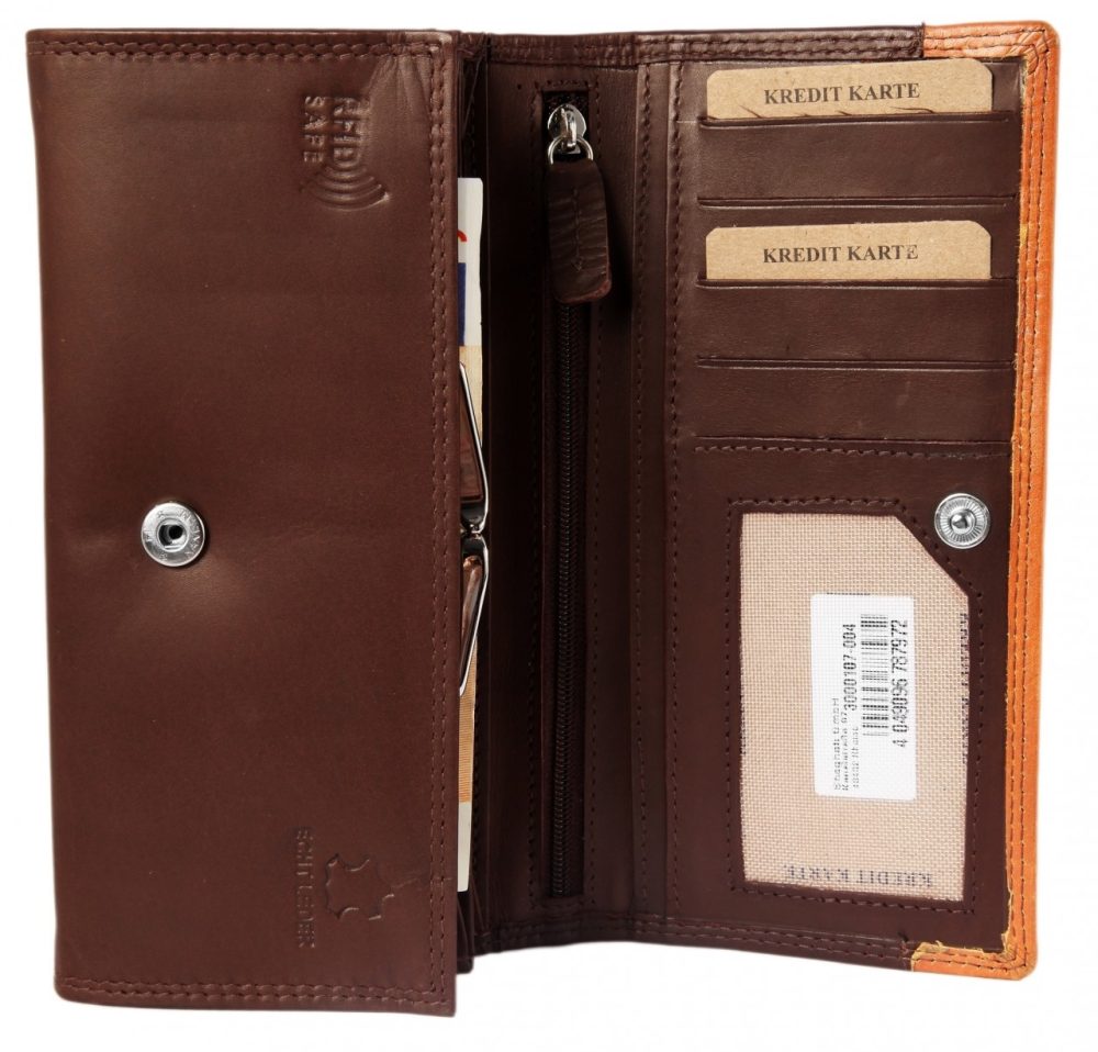 A carteira da marca Praktik é confeccionada em couro genuíno em formato paisagem. A particularidade desta carteira é que ela possui proteção RFID. Esta é uma camada protetora incorporada à carteira e evita que pessoas não autorizadas leiam dados, como cartões de crédito. A carteira pode ser aberta para cima e possui quatro compartimentos para cartões e um compartimento para identificação na metade superior, que pode ser visualizado através de uma rede transparente. Existem dois bolsos sob os slots para cartões que se estendem por toda a largura da carteira. Logo abaixo dos bolsos há um compartimento com zíper que serve bem como esconderijo para itens particulares e pode ser preenchido na metade inferior da carteira.