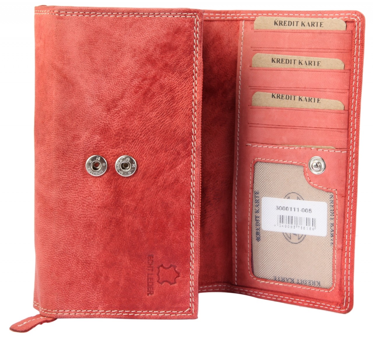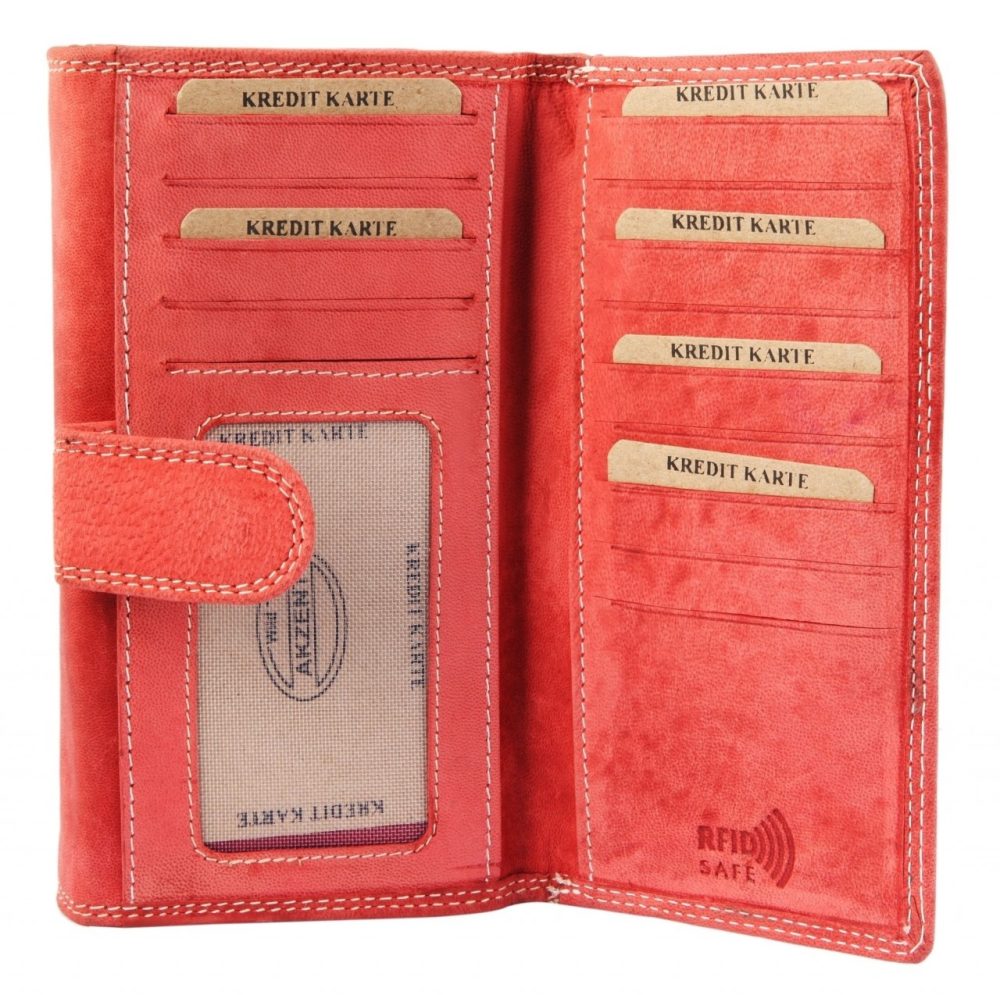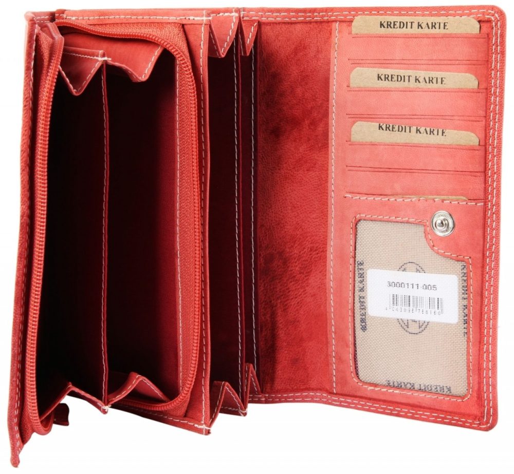 A carteira da marca Praktik é confeccionada em couro genuíno em formato paisagem. A particularidade desta carteira é que ela possui proteção RFID. Esta é uma camada protetora incorporada à carteira e evita que pessoas não autorizadas leiam dados, como cartões de crédito. A carteira pode ser aberta na frente com um botão clássico que pode ser ajustado em dois níveis diferentes e possui seis slots para cartões e um bolso transparente para identificação no interior. Há também um grande bolso sob os compartimentos para cartões. A parte frontal pode ser puxada para frente como um acordeão e possui dois compartimentos para notas. Há um grande bolso adicional atrás dos compartimentos para notas.