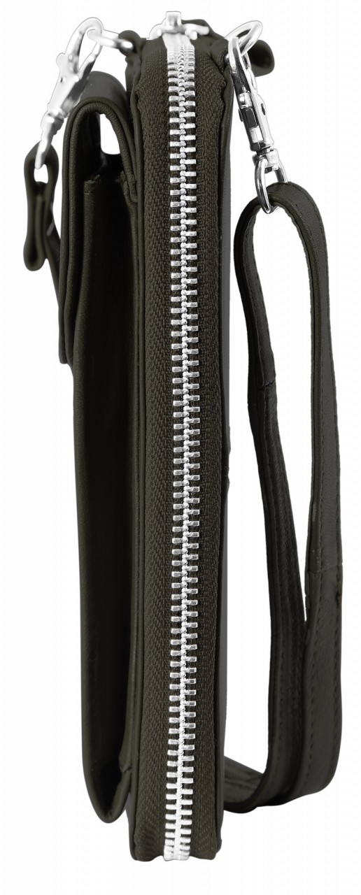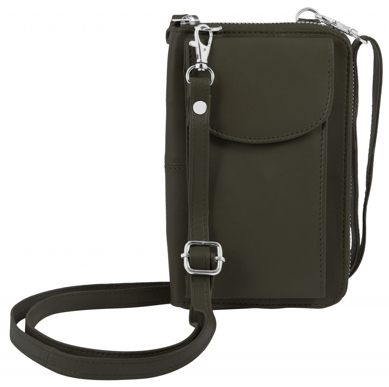 A bolsa de ombro para celular com carteira da marca Praktik é confeccionada em couro genuíno. É ideal para muitas atividades de lazer e pode substituir o incômodo de carregar uma bolsa grande. Apesar do seu tamanho compacto, oferece espaço de armazenamento suficiente para guardar tudo o que é importante de forma clara. Possui 6 compartimentos para cartões de crédito, 2 compartimentos para notas e 1 compartimento com zíper para pequenos trocos. A carteira pode ser aberta e fechada com zíper na área externa. O bolso do telemóvel pode ser facilmente aberto e fechado separadamente através de um botão. O tamanho da bolsa de ombro para celular é 18 cm de comprimento, 11,5 cm de largura e 4 cm de espessura. A alça também é feita de couro genuíno e tem comprimento máximo de 140 cm. Também é ajustável e removível.