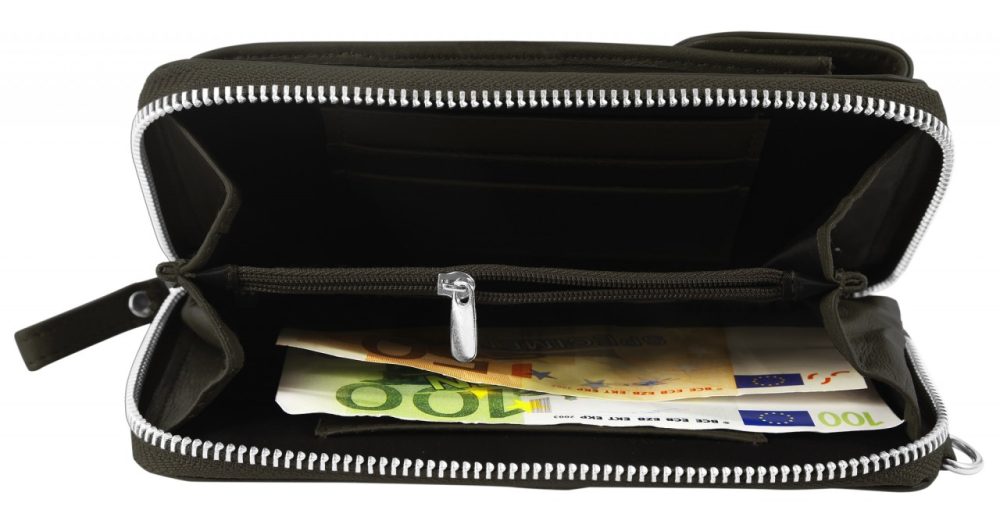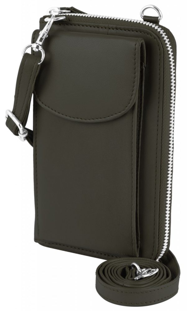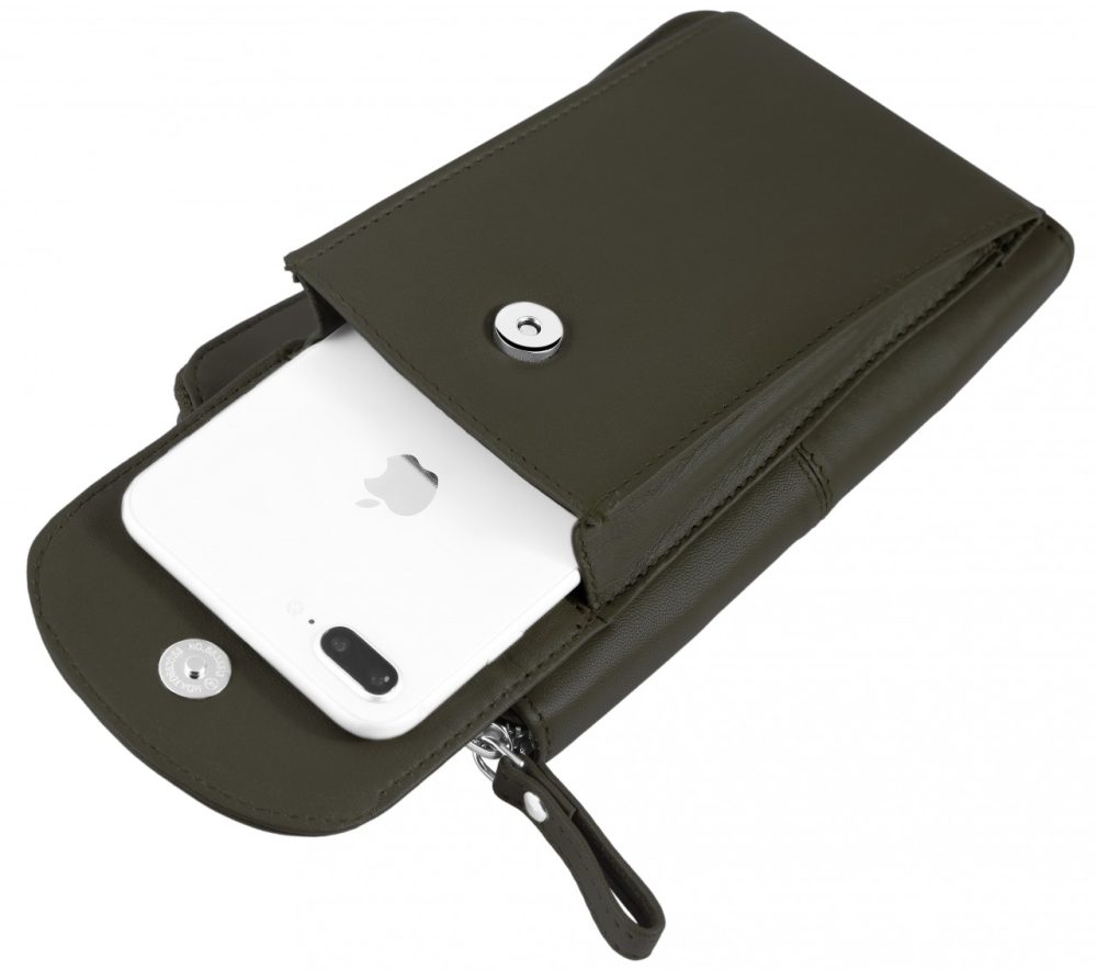 A bolsa de ombro para celular com carteira da marca Praktik é confeccionada em couro genuíno. É ideal para muitas atividades de lazer e pode substituir o incômodo de carregar uma bolsa grande. Apesar do seu tamanho compacto, oferece espaço de armazenamento suficiente para guardar tudo o que é importante de forma clara. Possui 6 compartimentos para cartões de crédito, 2 compartimentos para notas e 1 compartimento com zíper para pequenos trocos. A carteira pode ser aberta e fechada com zíper na área externa. O bolso do telemóvel pode ser facilmente aberto e fechado separadamente através de um botão. O tamanho da bolsa de ombro para celular é 18 cm de comprimento, 11,5 cm de largura e 4 cm de espessura. A alça também é feita de couro genuíno e tem comprimento máximo de 140 cm. Também é ajustável e removível.