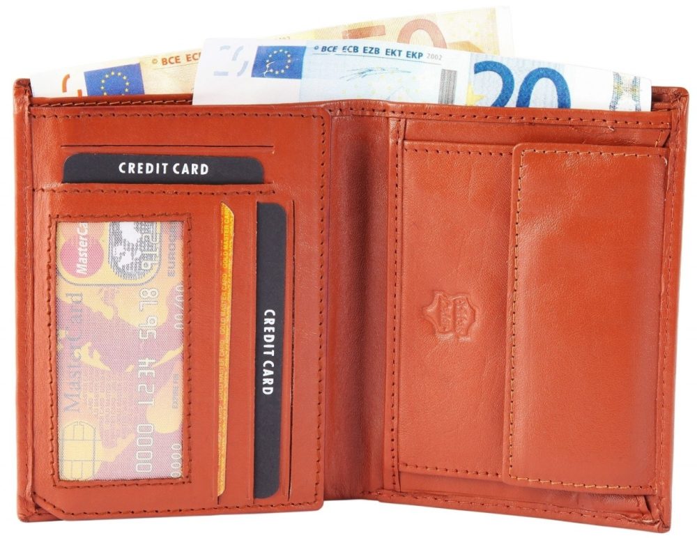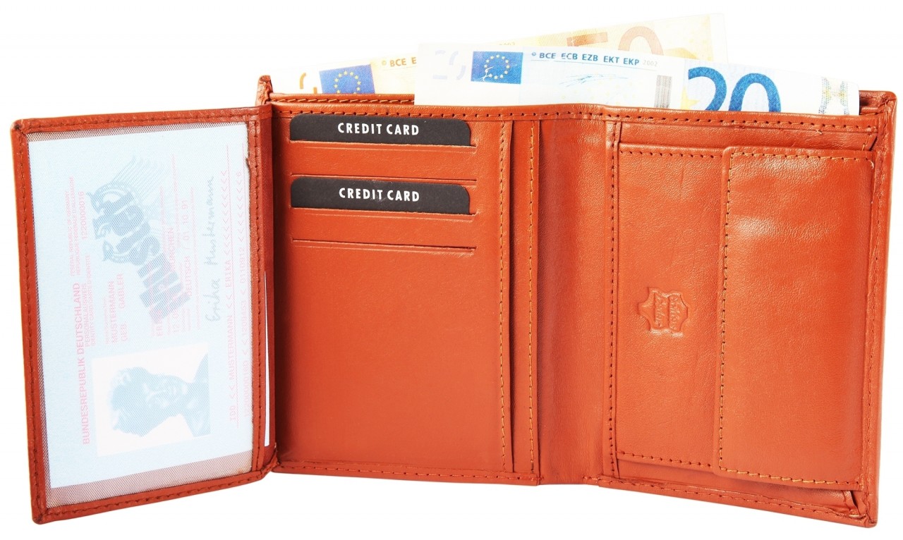 Carteira masculina de destaque feita de couro genuíno. A carteira retrato tem 9 cm de largura e 12 cm de altura. A cor é. Possui 2 compartimentos para notas, um compartimento para trocos, 10 compartimentos para cartões de crédito, um compartimento transparente para cartões de crédito e um compartimento transparente para identificação.