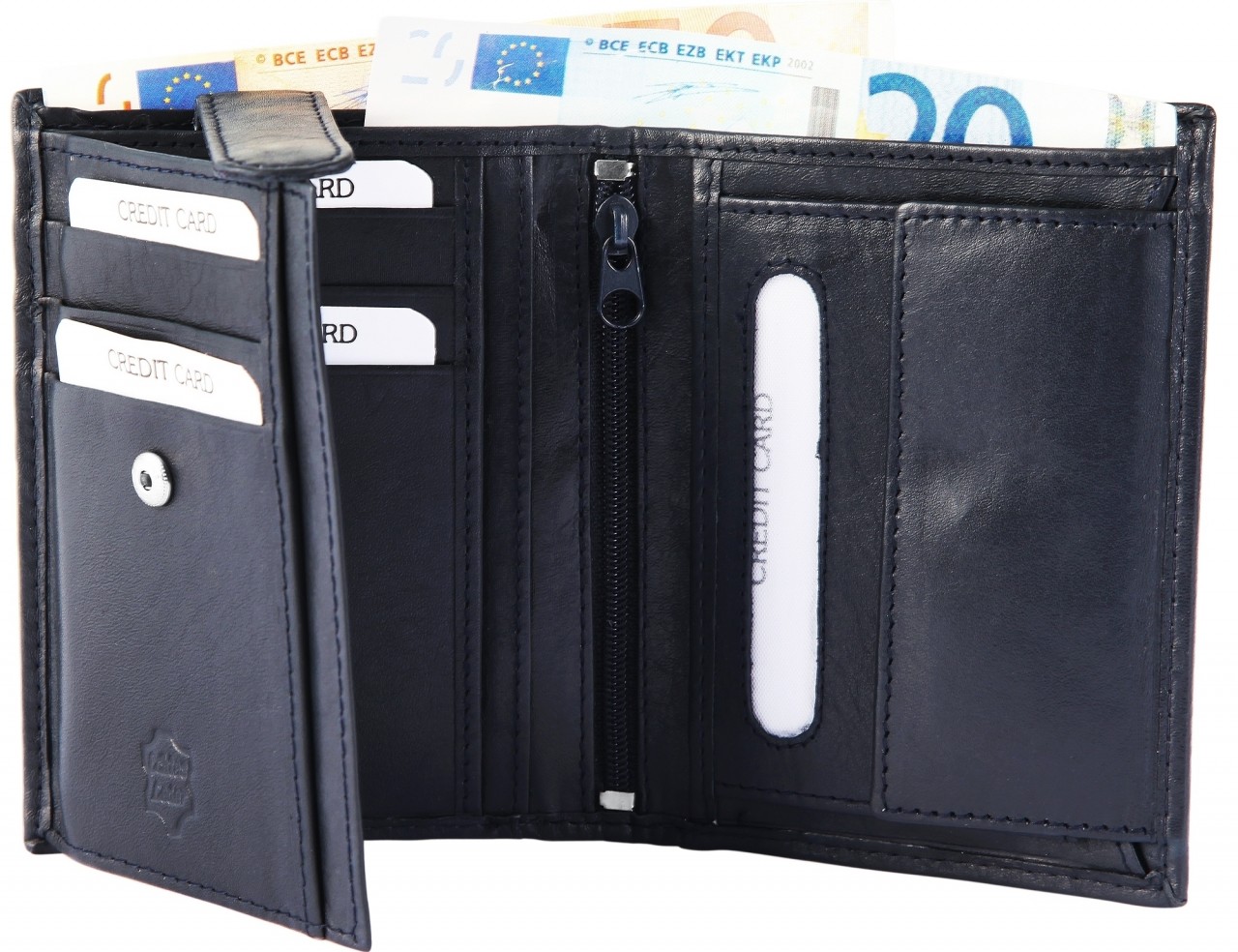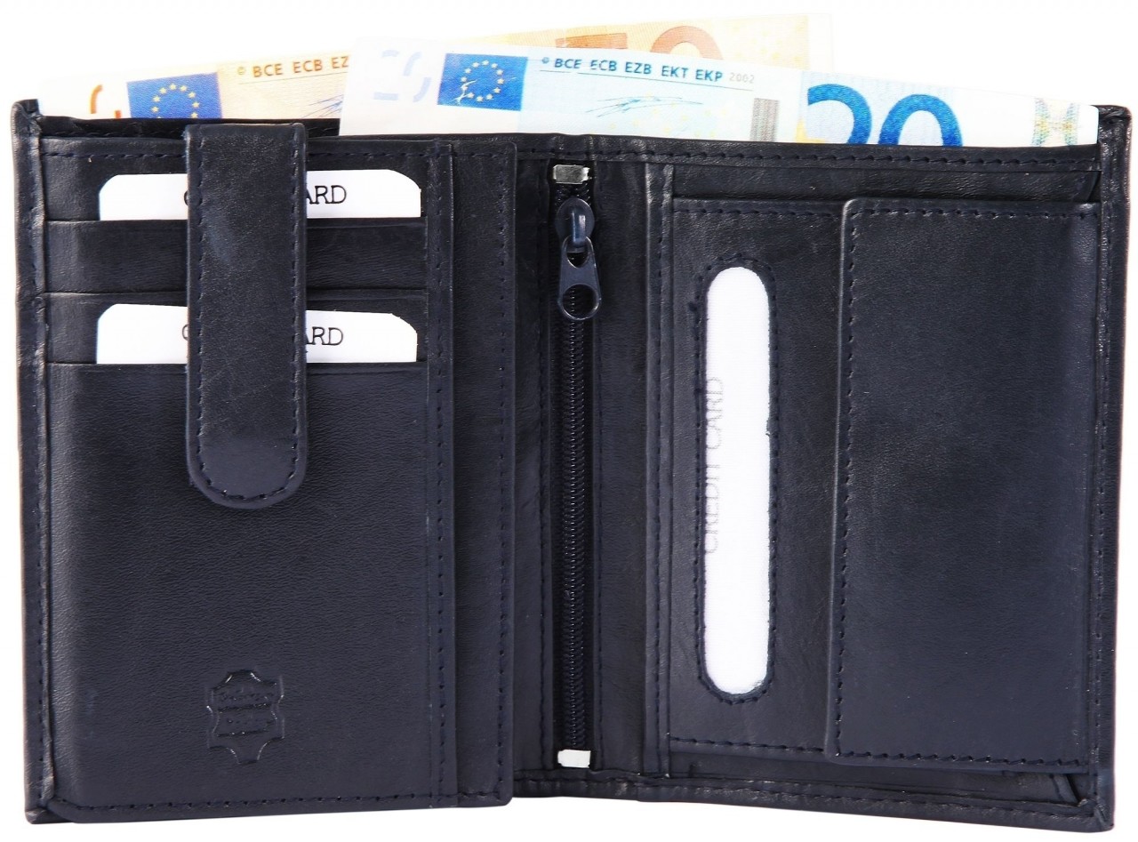 Carteira masculina de destaque feita de couro genuíno. A carteira retrato tem 9 cm de largura e 12 cm de altura. A cor é. Possui 2 compartimentos para notas, um compartimento para trocos, 10 compartimentos para cartões de crédito e um compartimento transparente para identificação.