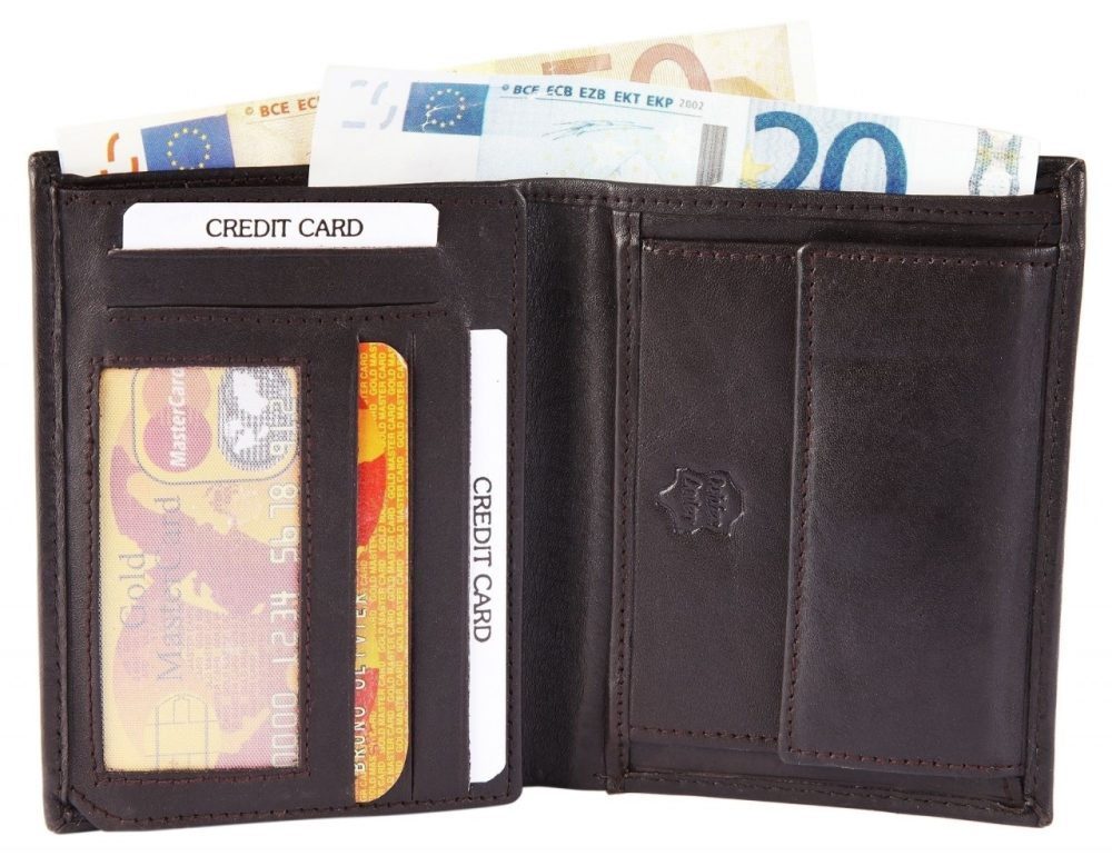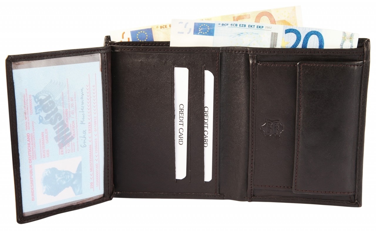 Carteira masculina de destaque feita de couro genuíno. A carteira retrato tem 9 cm de largura e 12 cm de altura. A cor é. Possui 2 compartimentos para notas, um compartimento para trocos, 9 compartimentos para cartões de crédito, um compartimento transparente para cartões de crédito e um compartimento transparente para identificação.
