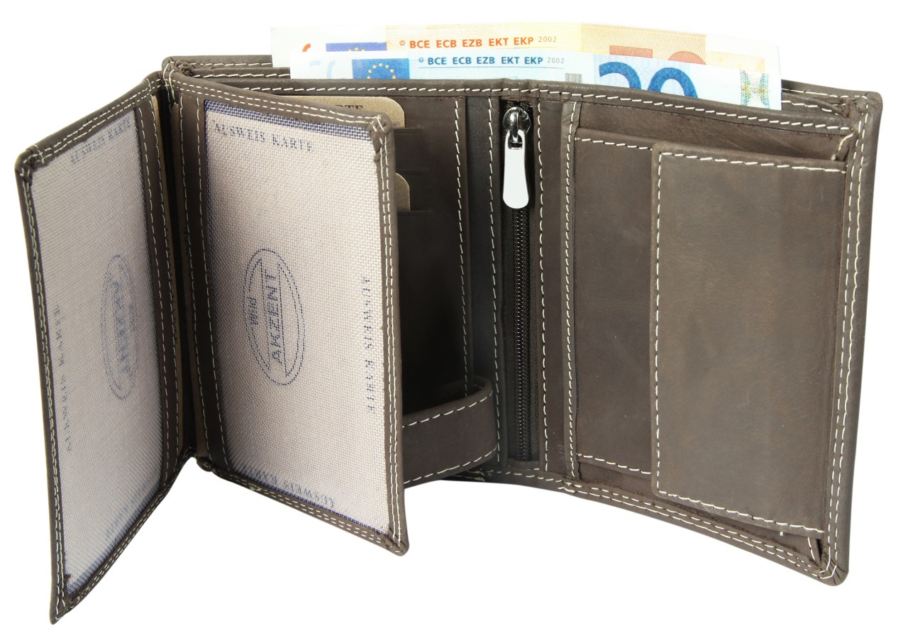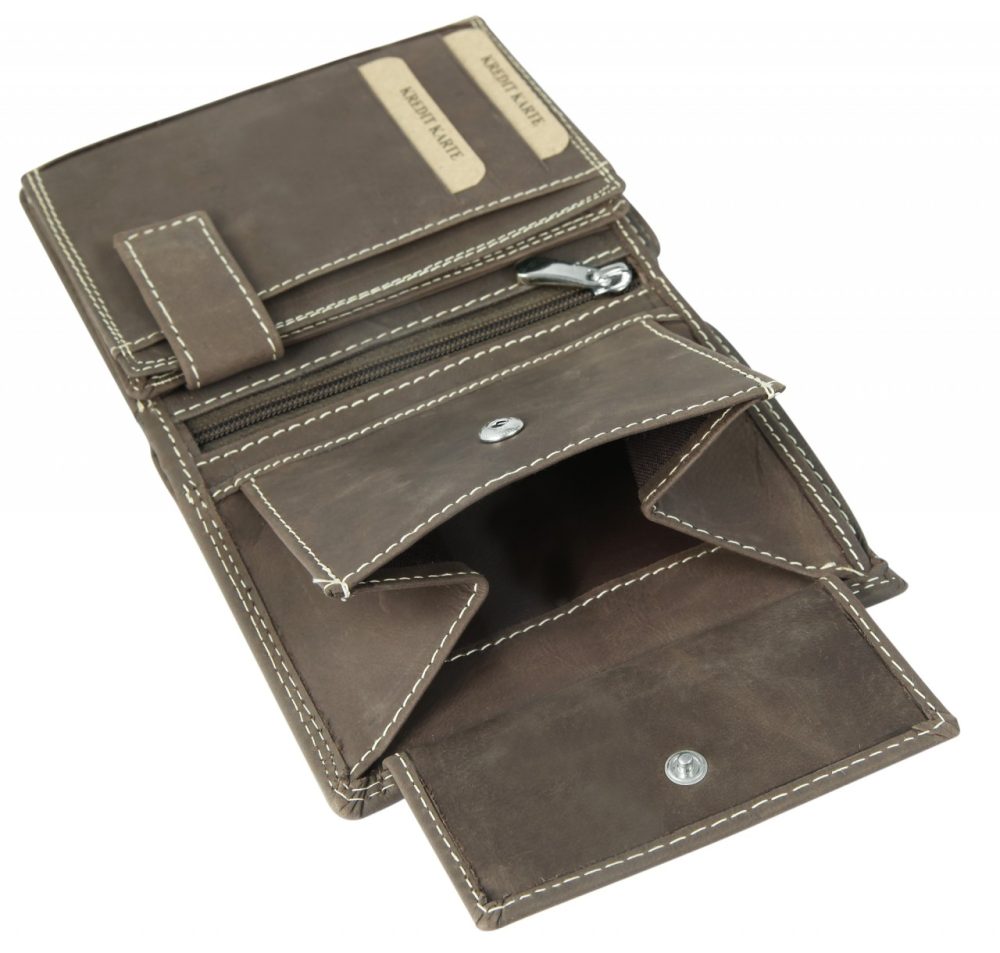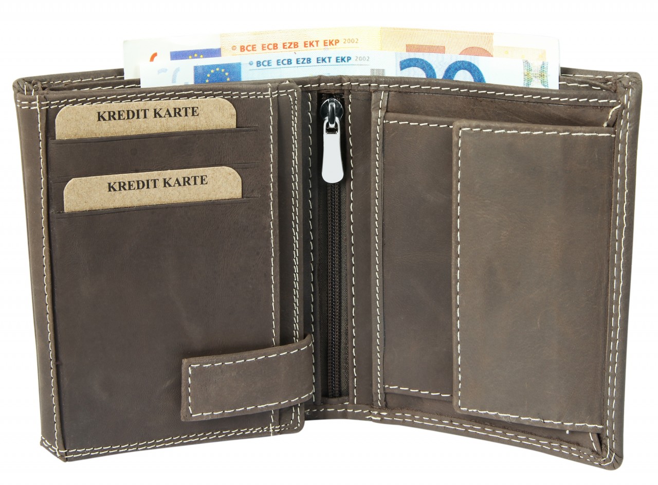 A carteira tem 9 cm de largura e 12 cm de altura e 2 cm de profundidade. Possui 2 compartimentos para notas, um compartimento para moedas, 9 compartimentos para cartões de crédito e 2 compartimentos transparentes para identificação.
