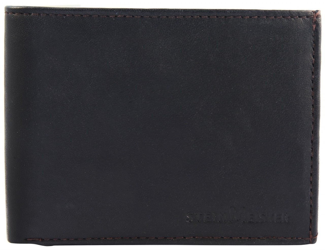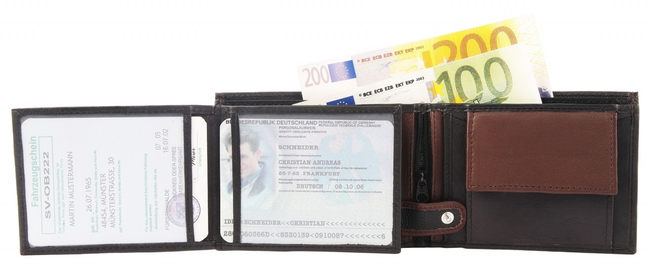 Carteira masculina de destaque feita de couro genuíno. A carteira paisagem tem 12 cm de largura e 10 cm de altura. A cor é preta. A carteira de couro genuíno é fechada com fecho de pressão. Possui 2 compartimentos para notas, um compartimento para trocos, 10 compartimentos para cartões de crédito, um compartimento transparente para cartões de crédito e 2 compartimentos transparentes para identificação.
