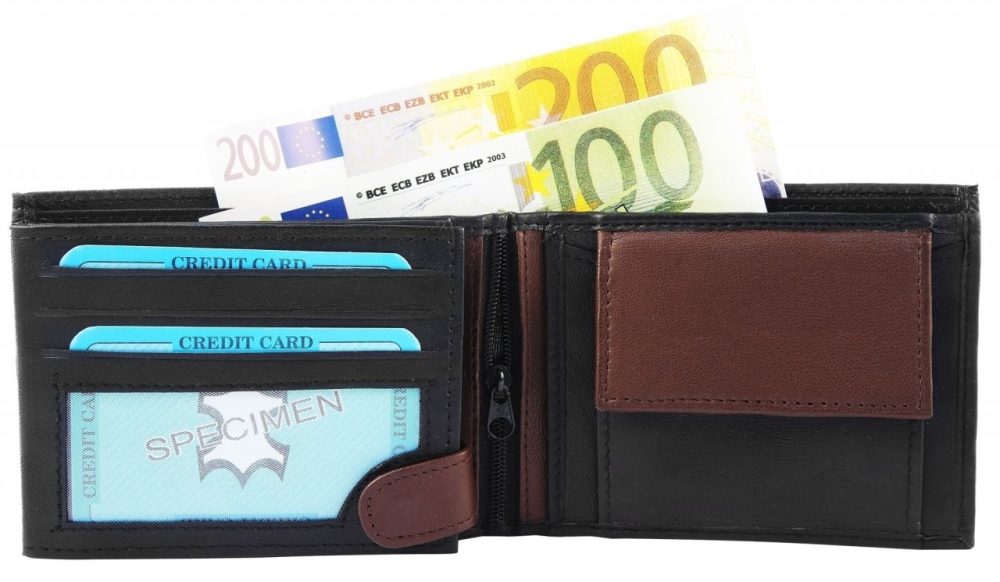 Carteira masculina de destaque feita de couro genuíno. A carteira paisagem tem 12 cm de largura e 10 cm de altura. A cor é preta. A carteira de couro genuíno é fechada com fecho de pressão. Possui 2 compartimentos para notas, um compartimento para trocos, 10 compartimentos para cartões de crédito, um compartimento transparente para cartões de crédito e 2 compartimentos transparentes para identificação.