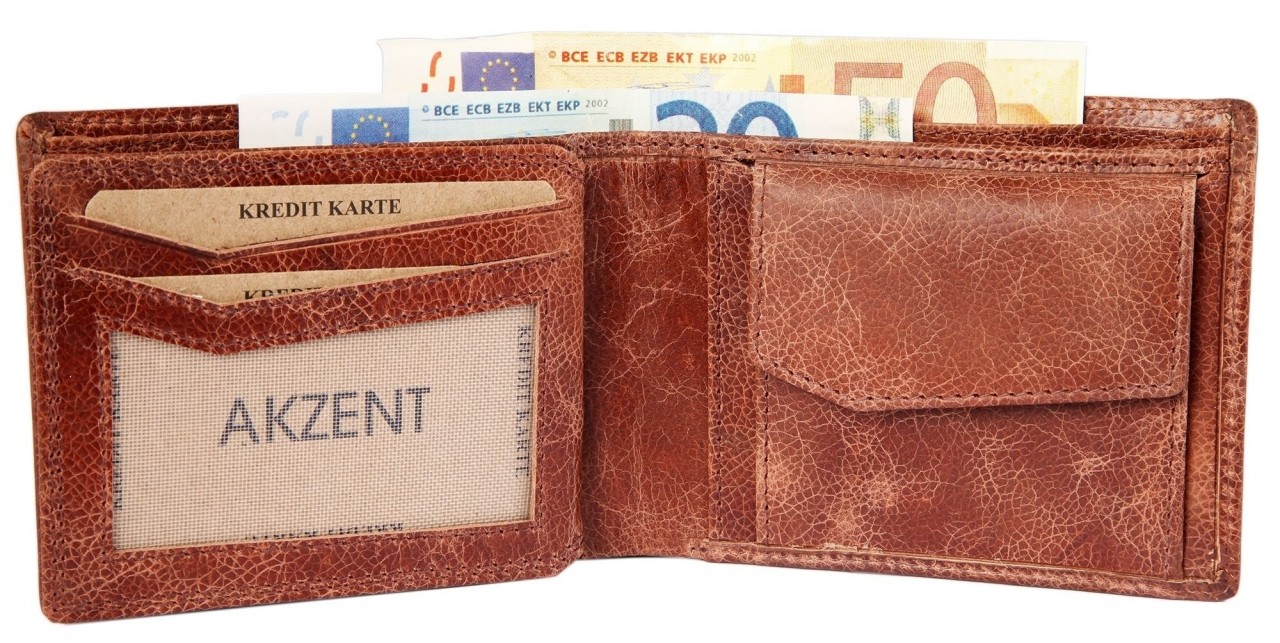 A carteira masculina da marca Praktik foi confeccionada em formato paisagem em couro genuíno. Possui superfície lisa e efeito usado. A costura dupla por fora e por dentro garante boa durabilidade e estabilidade. A carteira não é apenas um atrativo visual, mas também um verdadeiro milagre de espaço e oferece muito espaço de armazenamento para todos os documentos importantes. É dividido em 6 compartimentos para cartões de crédito, 2 bolsos deslizantes, 2 compartimentos para notas e 1 compartimento para moedas com fecho de botão de pressão. Graças à proteção RFID integrada, todos os cartões com chip estão protegidos contra ataques fraudulentos. O tamanho da bolsa é de 11 cm de largura, 9 cm de comprimento e 2 cm de espessura.