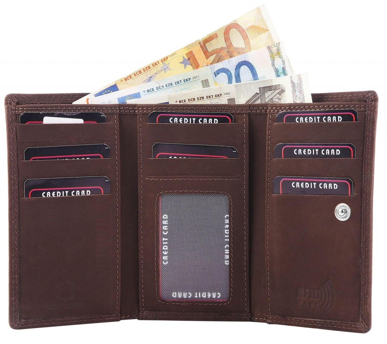 A carteira feminina da marca Praktik é confeccionada em formato paisagem em couro genuíno e apresenta estampa floral simples. A costura externa e interna da carteira garante boa durabilidade e estabilidade. A carteira não é apenas um atrativo visual, mas também um verdadeiro milagre de espaço e oferece muito espaço de armazenamento para todos os documentos importantes. A carteira está dividida em 14 compartimentos para cartões de crédito, um compartimento para identificação, um compartimento para notas com fecho, um compartimento normal sem fecho, um compartimento para moedas com chip de compras e 3 bolsos. A carteira fecha com um prático fecho de pressão no exterior e um fecho de clipe no compartimento para moedas. Graças à proteção RFID integrada, todos os cartões com chip estão protegidos contra ataques fraudulentos.