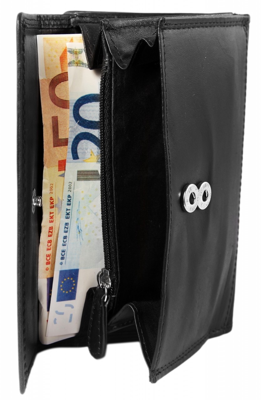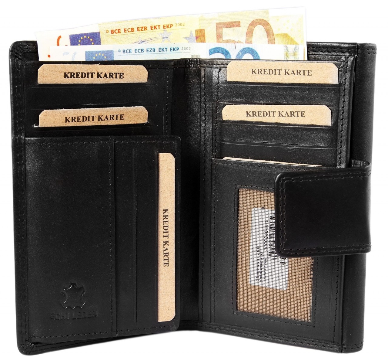 A carteira feminina negra da marca Praktik foi confeccionada em formato paisagem em couro genuíno. A costura dupla na parte externa e a costura única na parte interna da carteira garantem boa durabilidade e estabilidade. A carteira não é apenas um atrativo visual, mas também um verdadeiro milagre de espaço e oferece muito espaço de armazenamento para todos os documentos importantes. A carteira está dividida em 14 compartimentos para cartões de crédito, 1 compartimento para notas, 3 bolsos deslizantes, 1 compartimento para moedas e 1 compartimento com fecho de correr no interior. A carteira fecha com um prático fecho de pressão. O tamanho, sem preenchimento, tem 9,5 cm de comprimento, 15,5 cm de largura e 2,5 cm de espessura.