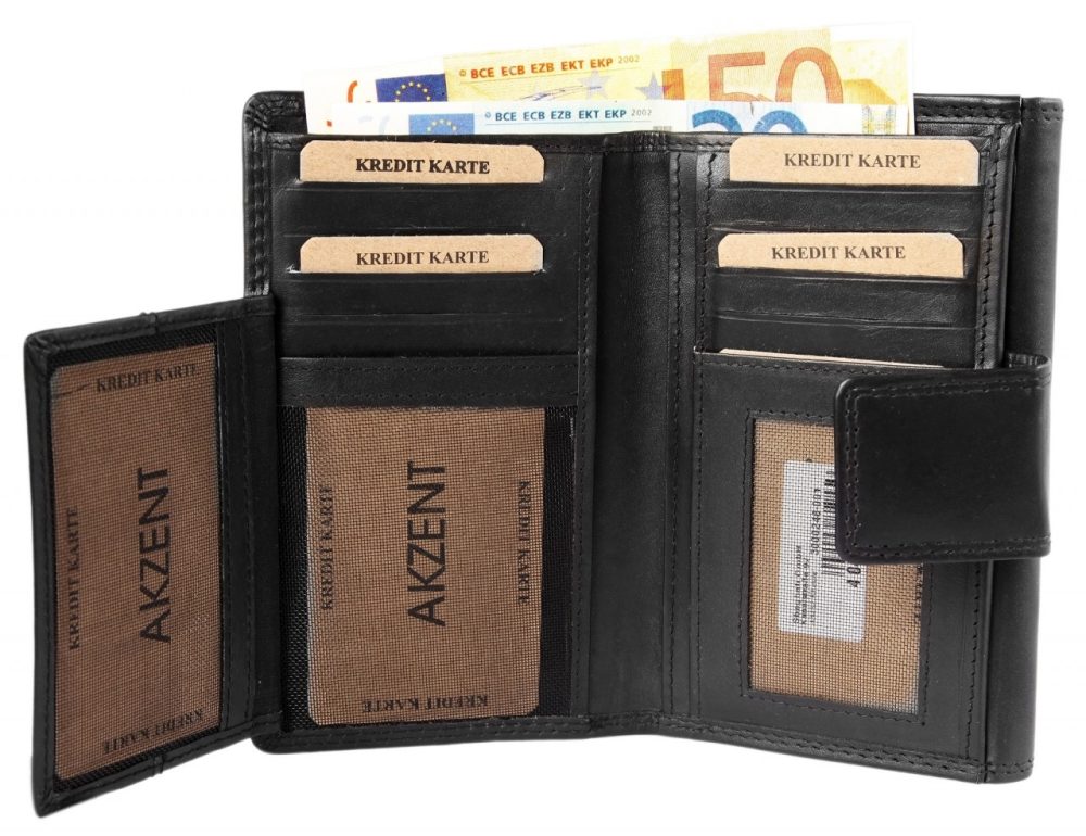 A carteira feminina negra da marca Praktik foi confeccionada em formato paisagem em couro genuíno. A costura dupla na parte externa e a costura única na parte interna da carteira garantem boa durabilidade e estabilidade. A carteira não é apenas um atrativo visual, mas também um verdadeiro milagre de espaço e oferece muito espaço de armazenamento para todos os documentos importantes. A carteira está dividida em 14 compartimentos para cartões de crédito, 1 compartimento para notas, 3 bolsos deslizantes, 1 compartimento para moedas e 1 compartimento com fecho de correr no interior. A carteira fecha com um prático fecho de pressão. O tamanho, sem preenchimento, tem 9,5 cm de comprimento, 15,5 cm de largura e 2,5 cm de espessura.