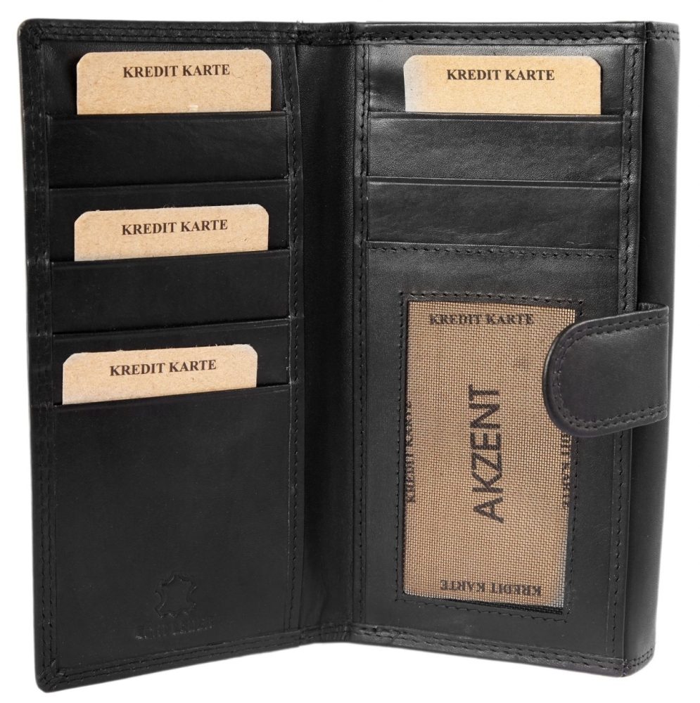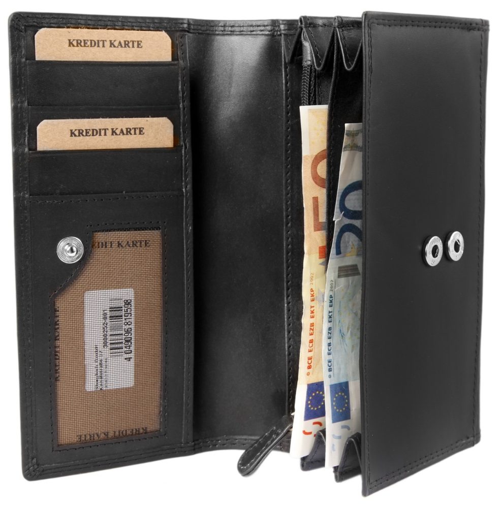 A carteira feminina da marca Praktik foi confeccionada em formato paisagem em couro genuíno. A costura dupla na parte externa e a costura única na parte interna da carteira garantem boa durabilidade e estabilidade. A carteira não é apenas um atrativo visual, mas também um verdadeiro milagre de espaço e oferece muito espaço de armazenamento para todos os documentos importantes. A carteira está dividida em 12 compartimentos para cartões de crédito, 3 compartimentos para notas, 4 bolsos deslizantes, 1 compartimento para moedas e 1 compartimento com fecho de correr no interior. A carteira fecha com um prático fecho de pressão. O tamanho, sem preenchimento, tem 9,5 cm de comprimento, 18 cm de largura e 3 cm de espessura.