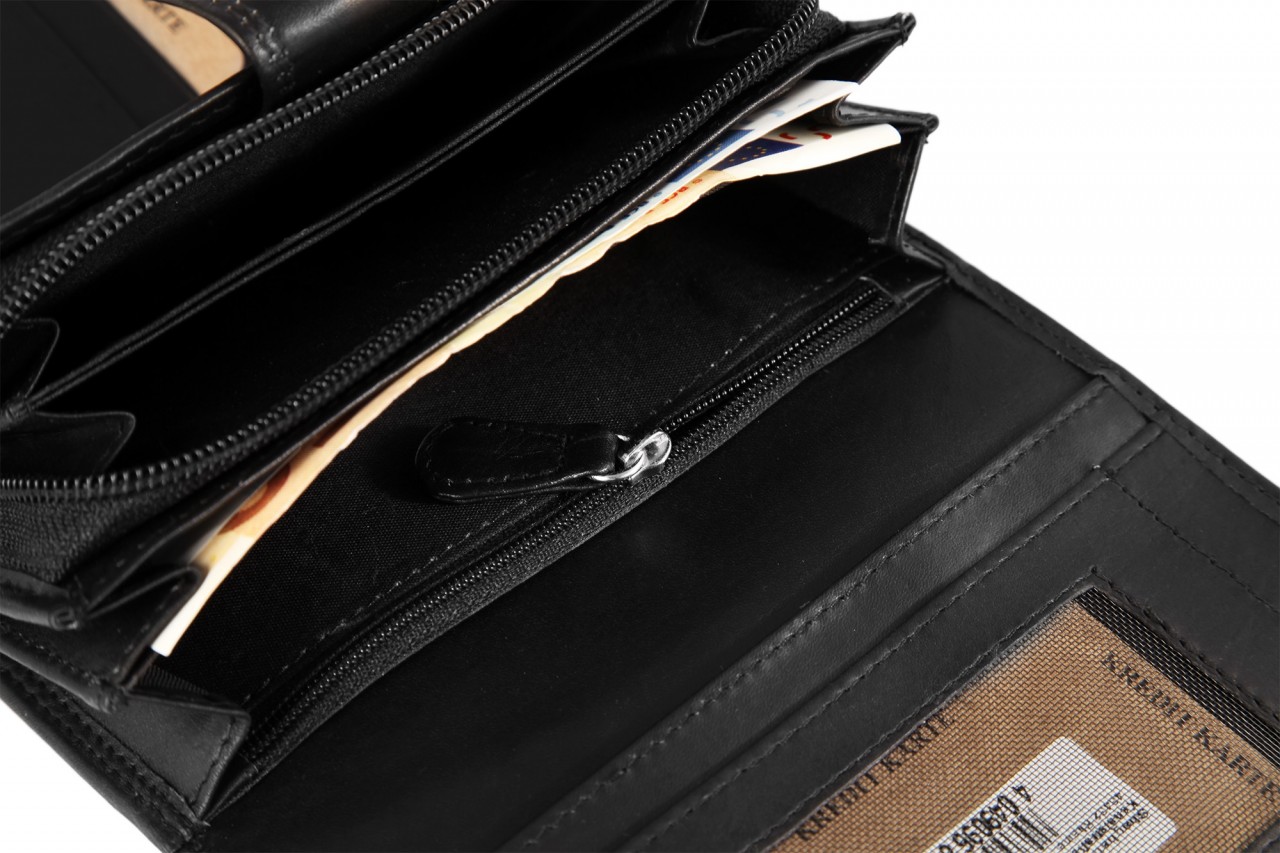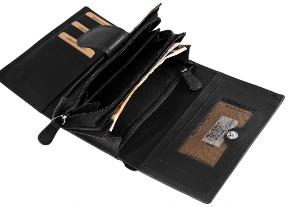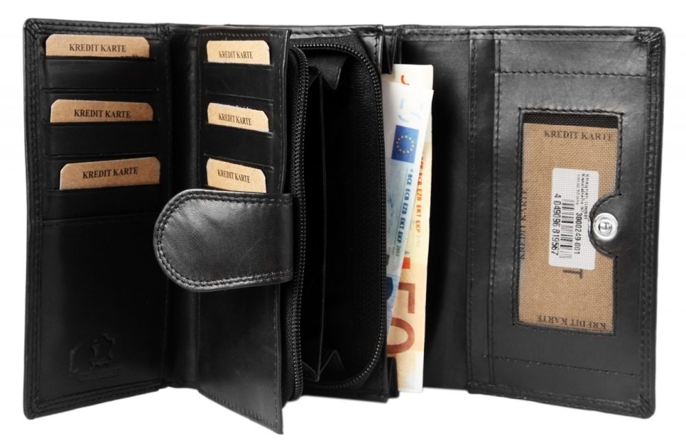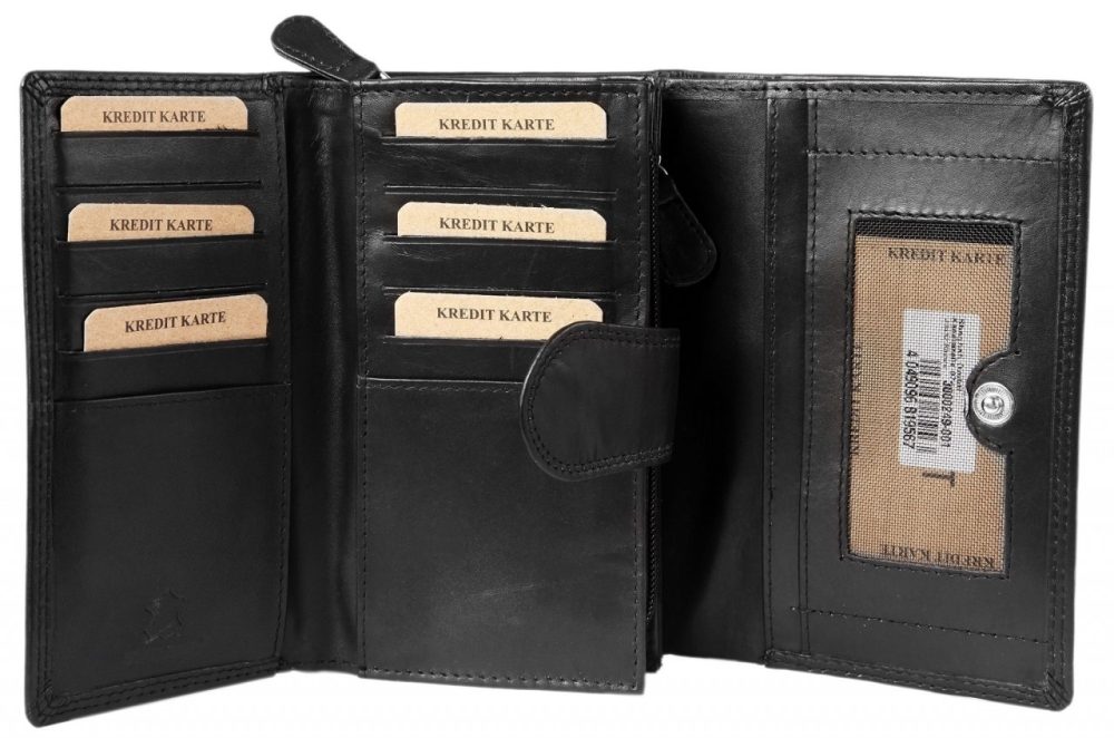 A carteira está dividida em 13 compartimentos para cartões de crédito, 3 compartimentos para notas, 5 bolsos deslizantes, 1 compartimento para moedas e 2 compartimentos com fecho de correr no interior. O tamanho, sem preenchimento, tem 10 cm de comprimento, 15.5 cm de largura e 4 cm de espessura.