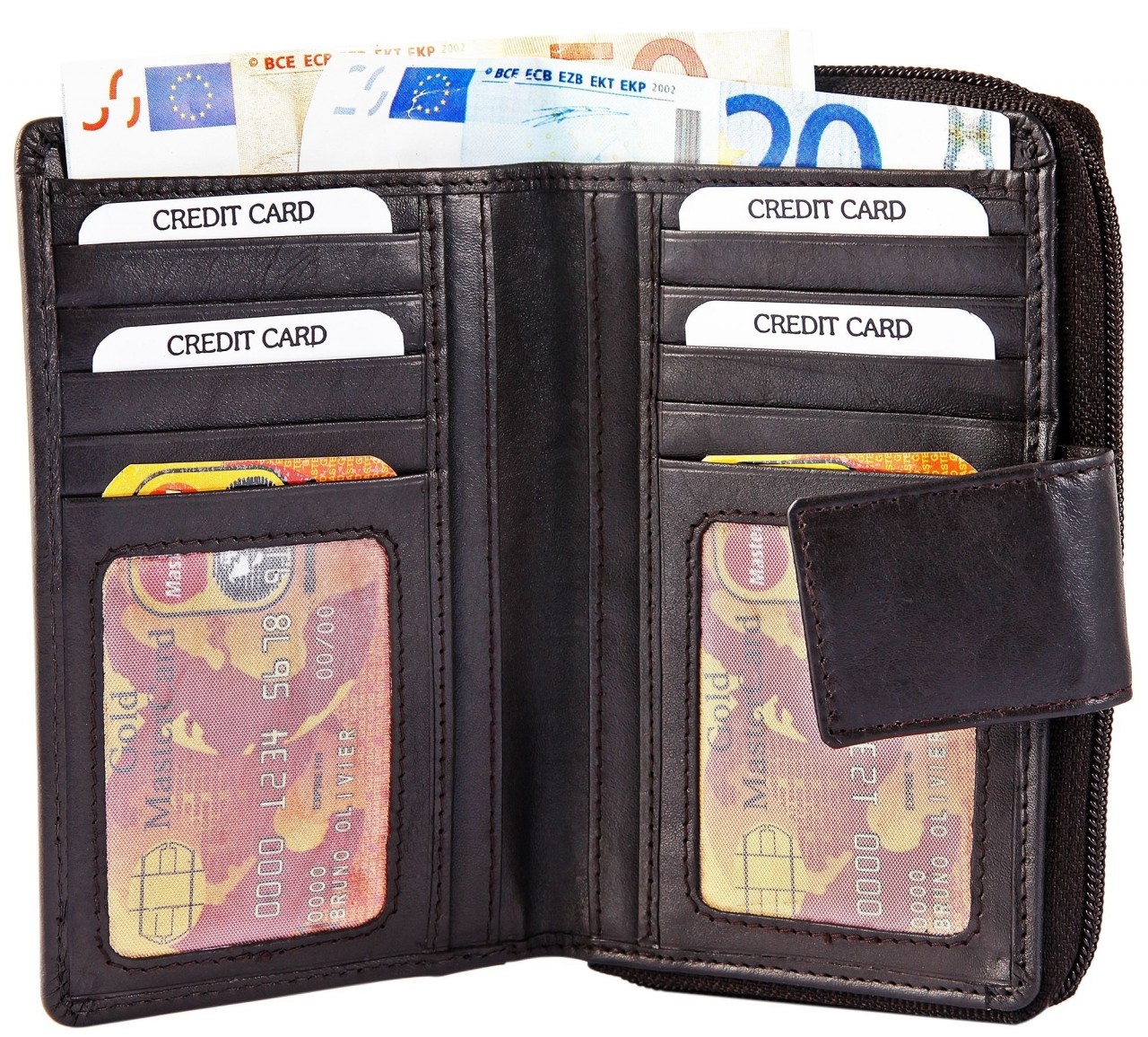 A carteira feminina em formato retrato da marca Praktik é confeccionada em couro bovino genuíno. O forro interno é feito principalmente de couro, parte dele é feito de tecido. A costura externa e interna da carteira garante boa durabilidade e estabilidade. A carteira não é apenas um atrativo visual, mas também um verdadeiro milagre de espaço e oferece muito espaço de armazenamento para todos os documentos importantes. A carteira está dividida em 10 compartimentos para cartões de crédito, 1 compartimento para notas, 4 bolsos deslizantes e 1 compartimento para moedas com fecho de correr no exterior. A carteira é fechada com um prático fecho de pressão na parte externa e um zíper no compartimento para moedas. O tamanho não preenchido tem 10,3 cm de comprimento, 16,5 cm de largura e 3,3 cm de espessura.