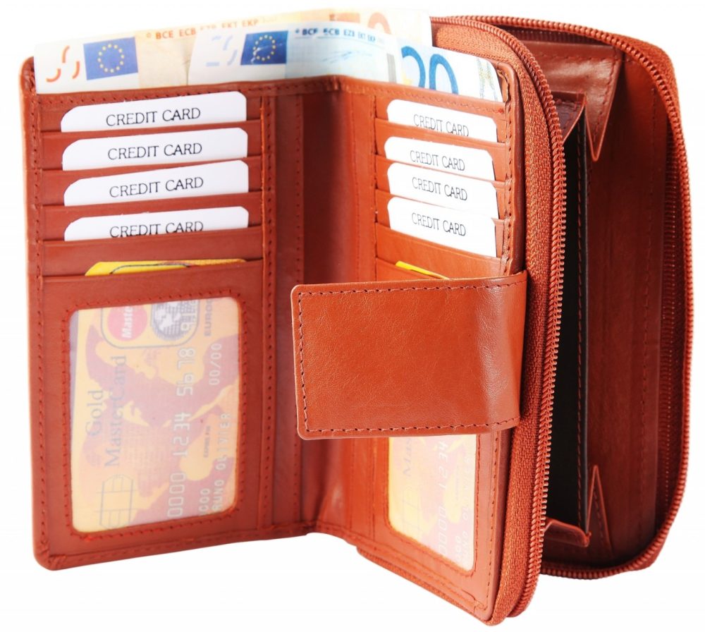 A carteira feminina em formato retrato da marca Praktik é confeccionada em couro bovino genuíno. O forro interno é feito principalmente de couro, parte dele é feito de tecido. A costura externa e interna da carteira garante boa durabilidade e estabilidade. A carteira não é apenas um atrativo visual, mas também um verdadeiro milagre de espaço e oferece muito espaço de armazenamento para todos os documentos importantes. A carteira está dividida em 10 compartimentos para cartões de crédito, 1 compartimento para notas, 4 bolsos deslizantes e 1 compartimento para moedas com fecho de correr no exterior. A carteira é fechada com um prático fecho de pressão na parte externa e um zíper no compartimento para moedas. O tamanho não preenchido tem 10,3 cm de comprimento, 16,5 cm de largura e 3,3 cm de espessura.