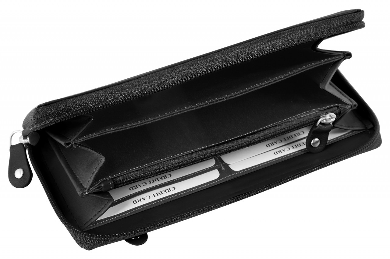 A carteira feminina da marca Praktik é confeccionada em formato paisagem em pele de cabra genuína e possui superfície lisa. A costura externa e interna da carteira garante boa durabilidade e estabilidade. A carteira é um verdadeiro milagre de espaço e oferece muito espaço de armazenamento para todos os documentos importantes. A carteira está dividida em 8 compartimentos para cartões de crédito, 4 compartimentos para notas, 1 compartimento para moedas, 1 compartimento exterior com fecho e 2 bolsos deslizantes. A carteira é fechada com zíper, para que o conteúdo fique bem guardado e seguro. O tamanho, sem preenchimento, tem 9,7 cm de comprimento, 19,3 cm de largura e 3,0 cm de espessura. Graças à proteção RFID integrada, todos os cartões com chip estão protegidos contra ataques fraudulentos.
