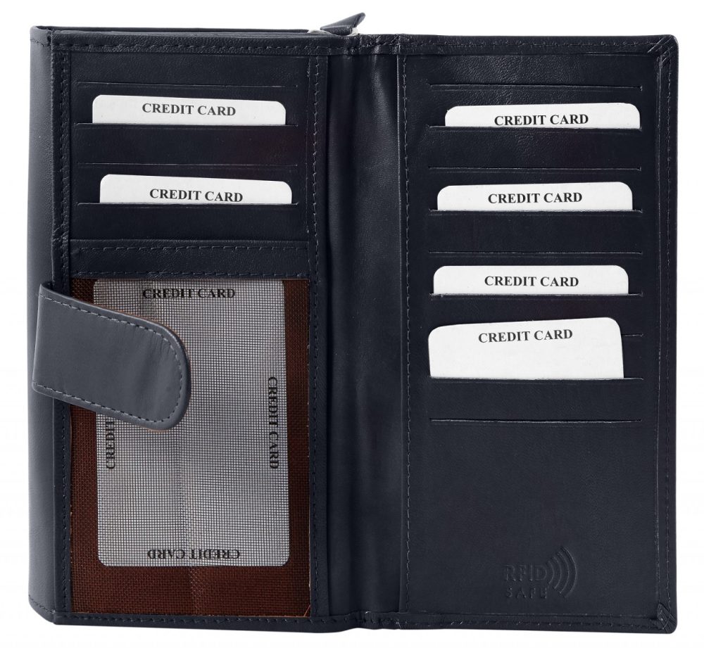A carteira feminina da marca Praktik é confeccionada em formato paisagem em pele de cabra genuína e possui superfície lisa. A costura externa e interna da carteira garante boa durabilidade e estabilidade. A carteira é um verdadeiro milagre de espaço e oferece muito espaço de armazenamento para todos os documentos importantes. A carteira está dividida em 19 compartimentos para cartões de crédito, 2 compartimentos para notas, 2 compartimentos para moedas, 2 compartimentos transparentes para identificação e 4 bolsos deslizantes. A carteira fecha com um prático fecho de pressão no exterior, o compartimento para moedas fecha com fecho. O tamanho não preenchido tem 10,1 cm de comprimento, 17,2 cm de largura e 4,2 cm de espessura. Graças à proteção RFID integrada, todos os cartões com chip estão protegidos contra ataques fraudulentos.