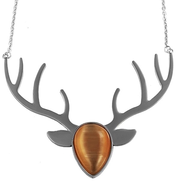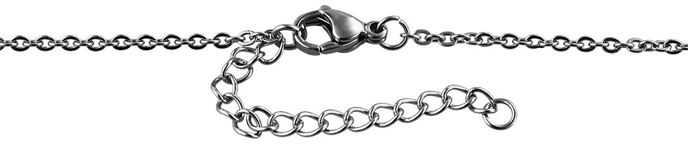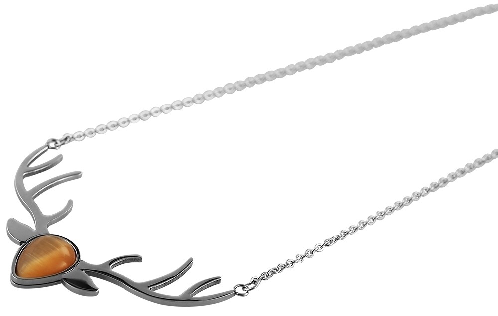 O colar prateado da marca Praktik é feito de aço inoxidável. As dimensões da corrente são 40 cm de comprimento, 1 mm de espessura e 1 mm de largura. O colar também possui um pingente feito de aço inoxidável e decorado com uma elegante pedra olho de gato. O tamanho do pingente é 60 mm de largura e 50 mm de altura. O pingente é prateado. A corrente pode ser aberta e fechada com um fecho mosquetão, também feito de aço inoxidável.