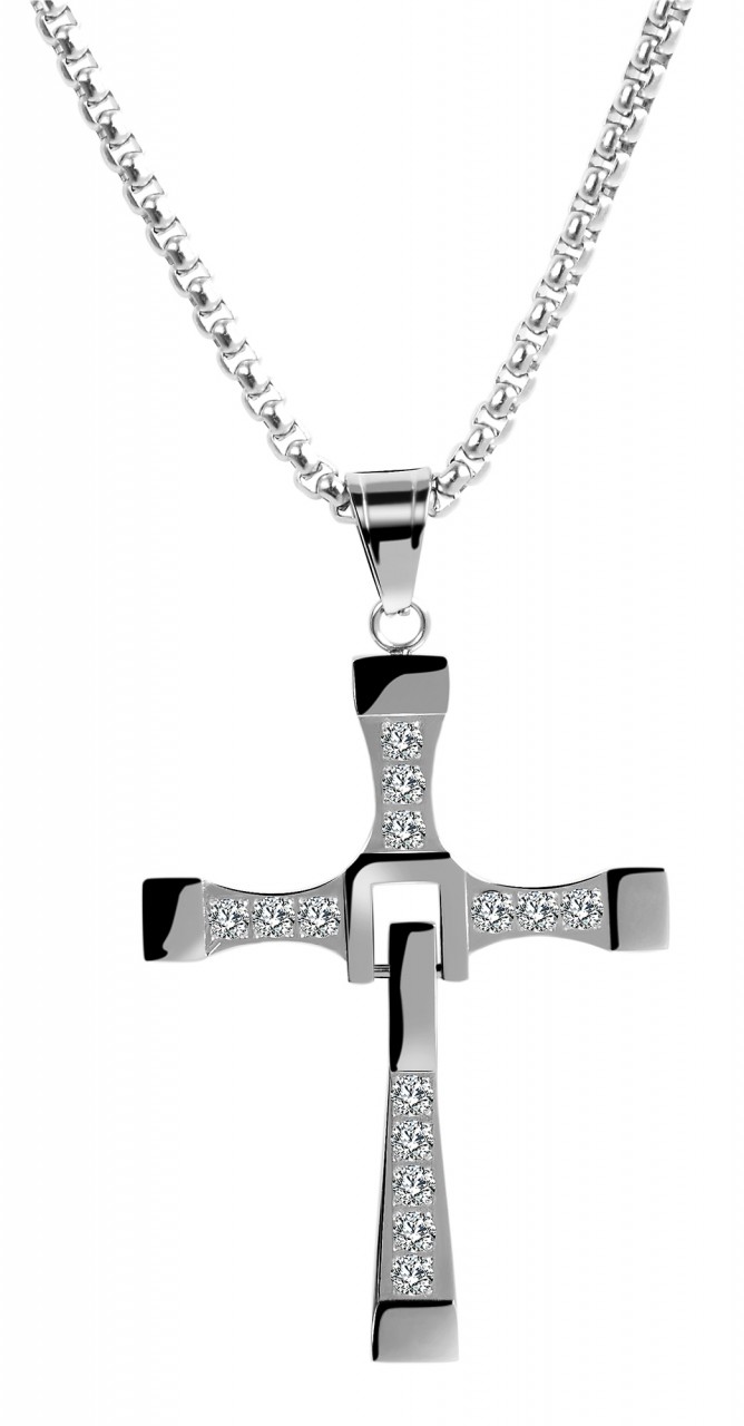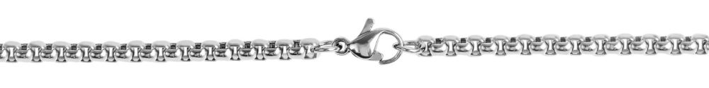 A corrente veneziana da marca Praktik é feita de aço inoxidável e está disponível em várias cores. Tem 61 cm de comprimento, 3,5 mm de largura e 3,5 mm de espessura. O pingente de cruz correspondente também é feito de aço inoxidável e decorado com pedras simili. As dimensões do pingente são 57 mm de comprimento, 40 mm de largura e 3 mm de espessura. A corrente pode ser aberta e fechada com um fecho mosquetão de aço inoxidável.