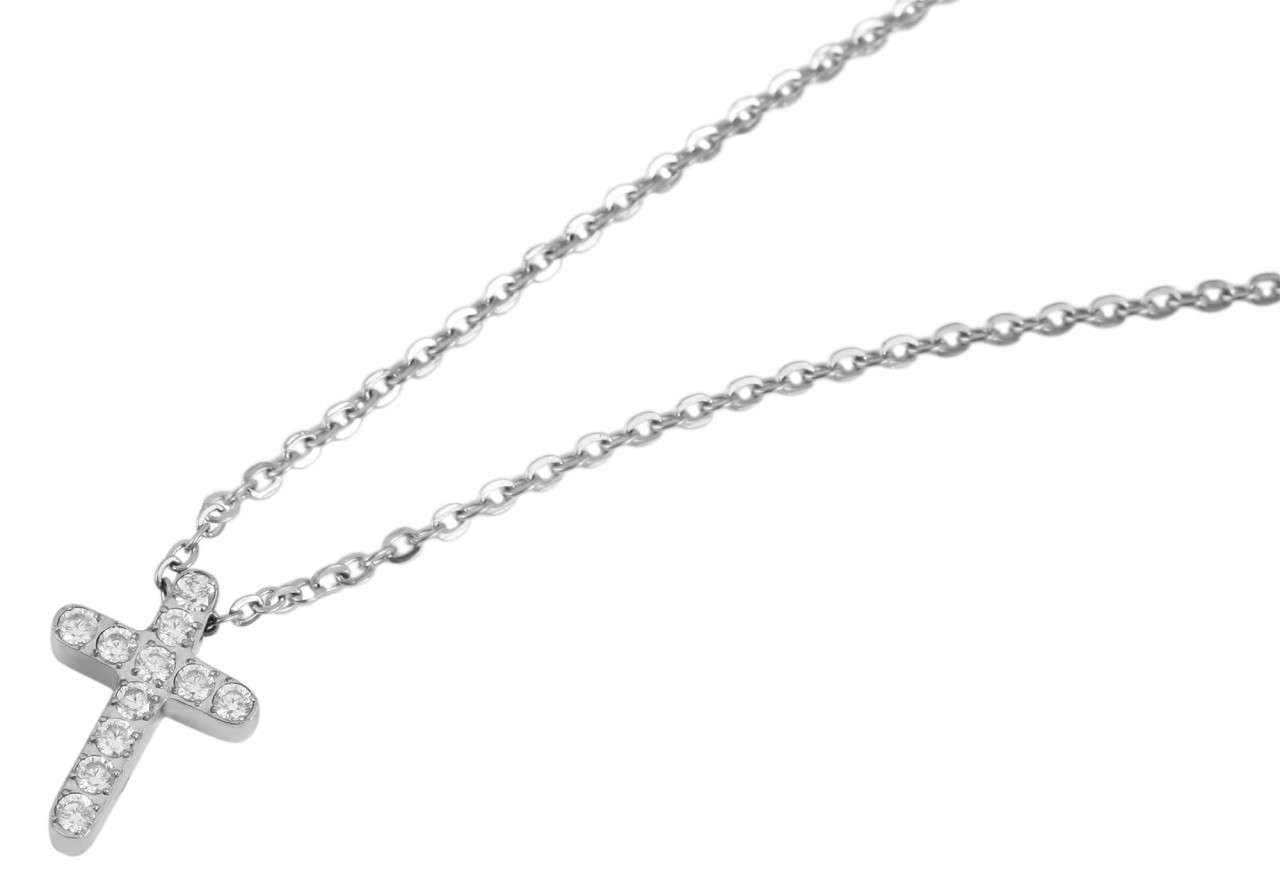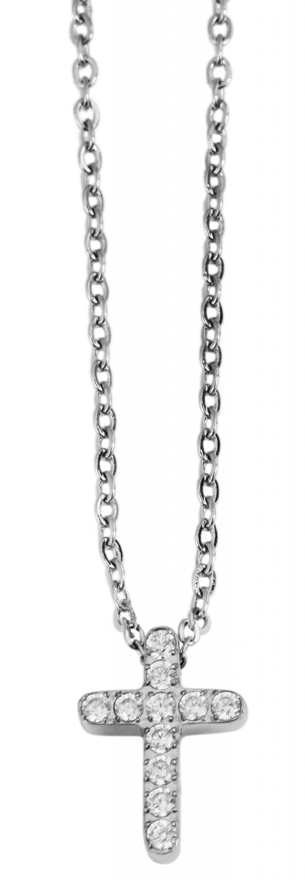 O colar feminino da marca Praktik tem padrão âncora e é feito de aço inoxidável. As dimensões da corrente são comprimento de 43 cm, largura de 1 mm e espessura de 1 mm. A corrente também possui um pingente de cruz. O pingente é decorado com pedras simili e tem 13 mm de comprimento, 9 mm de largura e 3 mm de espessura. A corrente pode ser aberta e fechada com fecho lagosta, também feito de aço inoxidável.