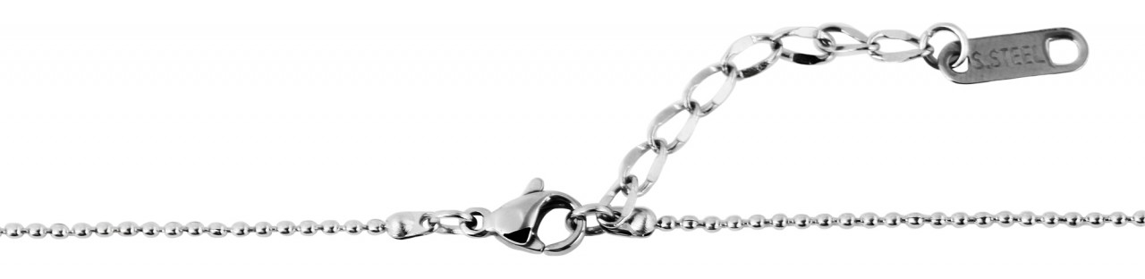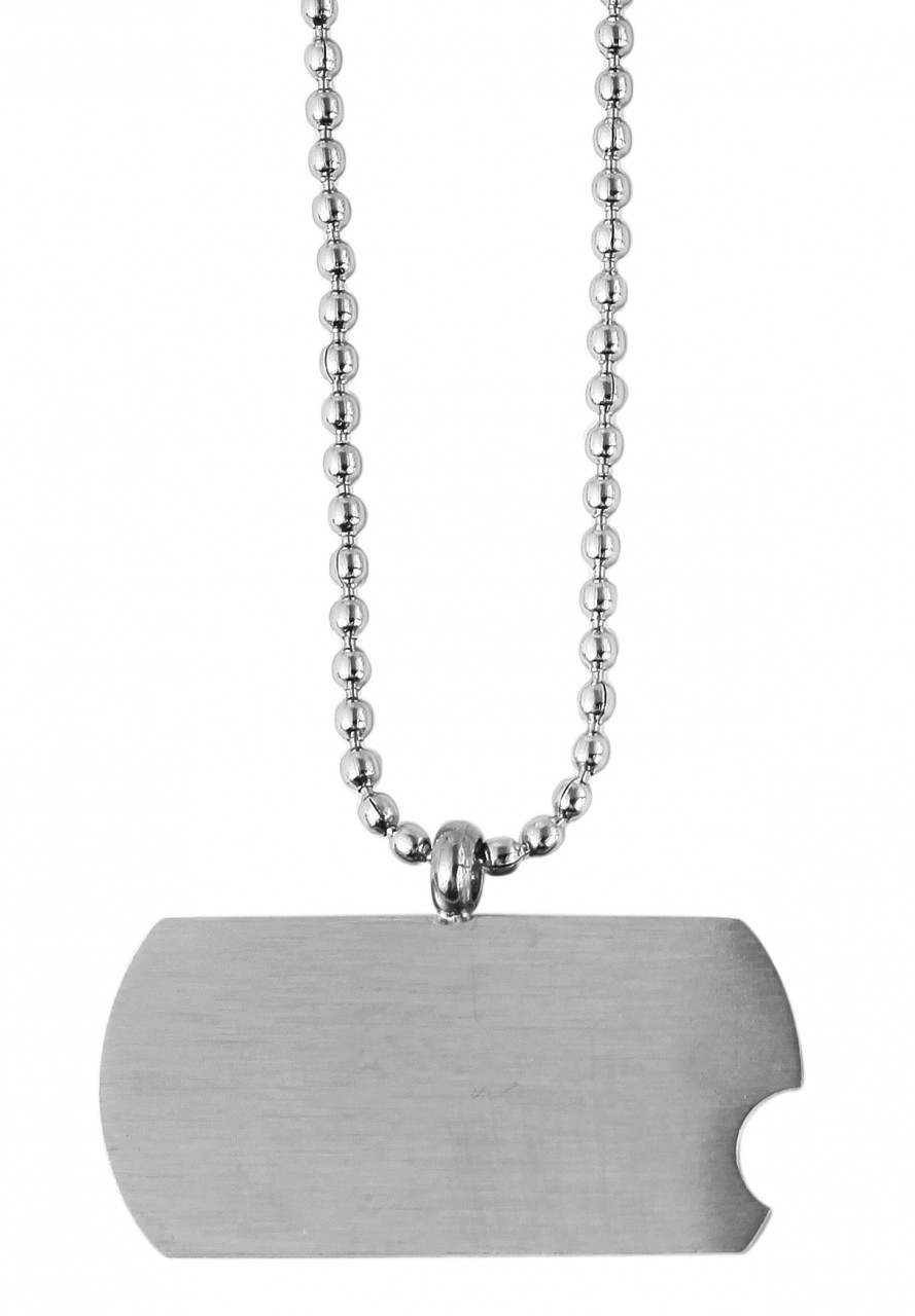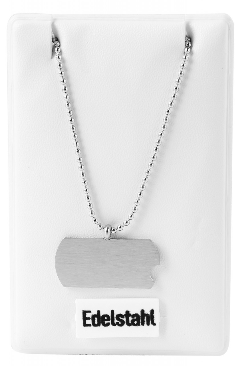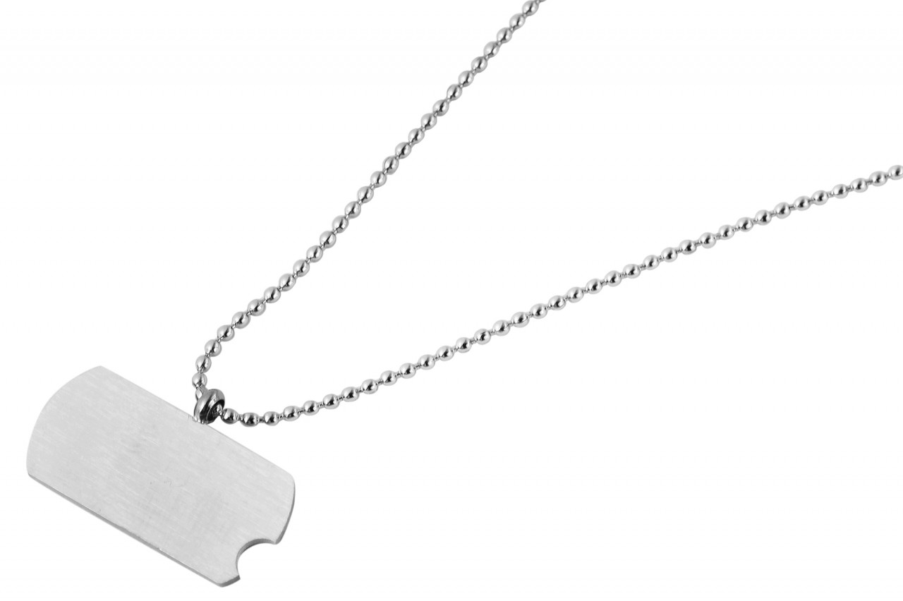 A corrente de bola com pingentes graváveis da marca theazim é feita de aço inoxidável. O colar de aço inoxidável com pingente é prateado. Outra característica do pingente é a falta do canto da placa de gravação. As dimensões da corrente são: comprimento 43 + 5 cm e espessura 1 mm. As dimensões do pingente são: comprimento 10 mm, largura 21 mm e espessura 1 mm.
