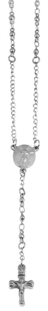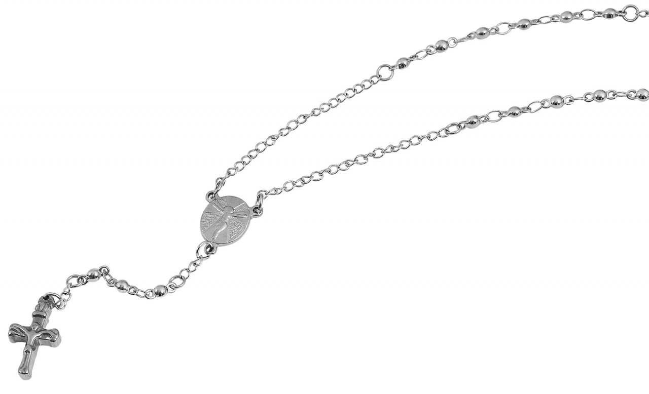 Esta corrente de rosário com pingente cruzado é feita de aço inoxidável resistente e hipoalergênico, que é durável e resistente. O fecho lagosta garante uma fixação segura e garante que a joia permaneça sempre no lugar. A corrente de 50 cm de comprimento no padrão corrente âncora é decorada com bolinhas distribuídas uniformemente que lhe dão um toque especial. O pingente cruz 75 x 10 mm é o destaque do colar e simboliza a fé, a esperança e o amor. O pingente de aço inoxidável é artisticamente trabalhado e não só dá à joia um toque religioso, mas também um toque de elegância. Este colar é um presente maravilhoso para ocasiões religiosas como batismo, comunhão ou confirmação com um significado mais profundo.